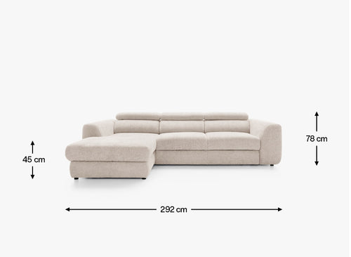 Left-hand corner sofa · sleeping function · bedding container · adjustable headrests