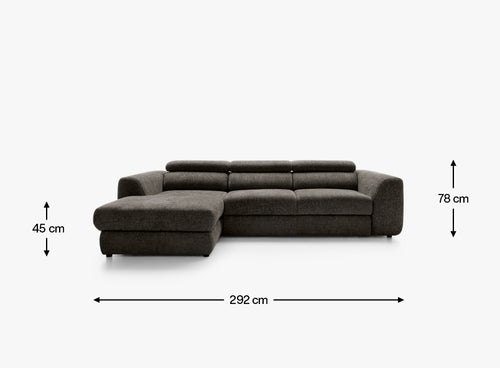 The furniture's overall dimensions – 292 cm wide , 78 cm high (99 cm with headrests raised) , and 112 cm deep – make it a focal point of any interior. The 3 cm high legs lend a light feel, while the subtly rounded armrests (65 cm high) add a cozy touch to its modern look.