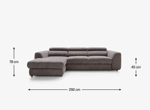 The furniture's overall dimensions – 292 cm wide , 78 cm high (99 cm with headrests raised) , and 112 cm deep – make it a focal point of any interior. The 3 cm high legs lend a light feel, while the subtly rounded armrests (65 cm high) add a cozy touch to its modern look.