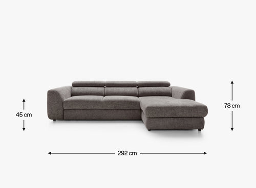 The furniture's overall dimensions – 292 cm wide , 78 cm high (99 cm with headrests raised) , and 112 cm deep – make it a focal point of any interior. The 3 cm high legs lend a light feel, while the subtly rounded armrests (65 cm high) add a cozy touch to its modern look.