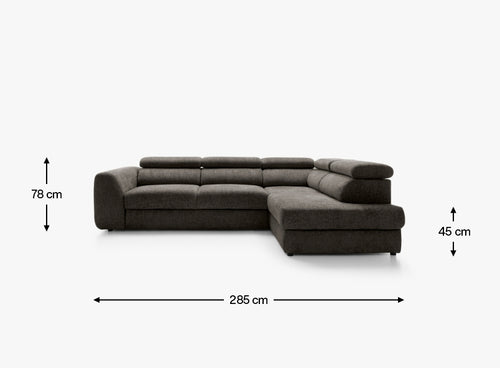 Right-hand corner sofa · sleeping function · bedding container · adjustable headrests