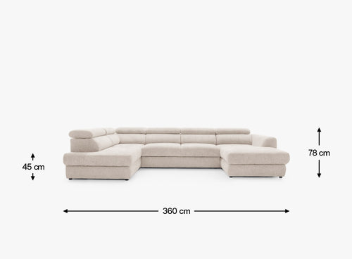 The sofa's overall dimensions – 360 cm wide, 78 cm high (99 cm with headrests raised), and 112 cm deep – make it a dominant yet harmonious element in any modern interior. The 65 cm high armrests with rounded edges add a cozy feel, while the low legs (3 cm) lend a lightness to the entire structure.