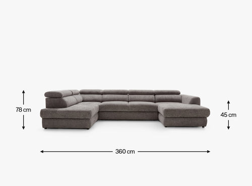 The sofa's overall dimensions – 360 cm wide, 78 cm high (99 cm with headrests raised), and 112 cm deep – make it a dominant yet harmonious element in any modern interior. The 65 cm high armrests with rounded edges add a cozy feel, while the low legs (3 cm) lend a lightness to the overall structure.