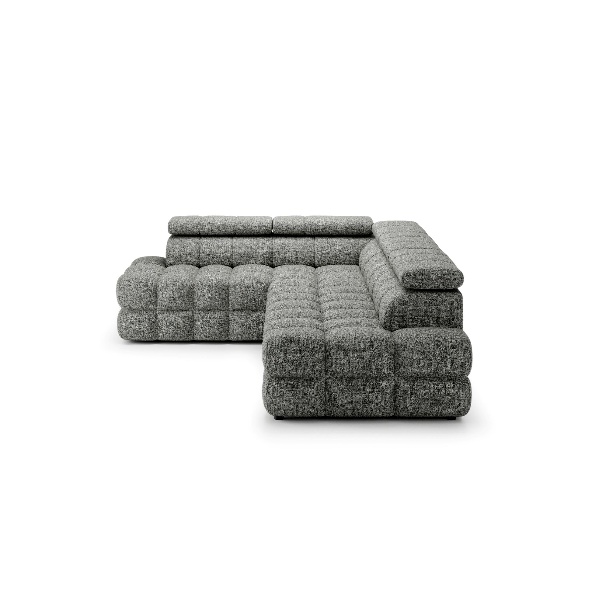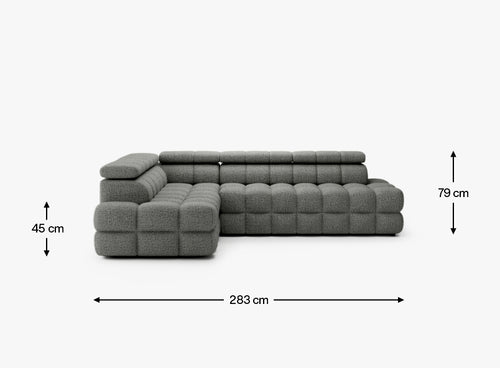 Przemyślany układ bryły (212 cm głębokości oraz 283 cm szerokości) sprawia, że narożnik harmonijnie wypełnia przestrzeń, stając się jej dominującym, ale eleganckim elementem. Siedzisko o wysokości 45 cm oraz zmienna wysokość korpusu (79–101 cm z uniesionymi zagłówkami) nadają całości nowoczesny, przytulny charakter.