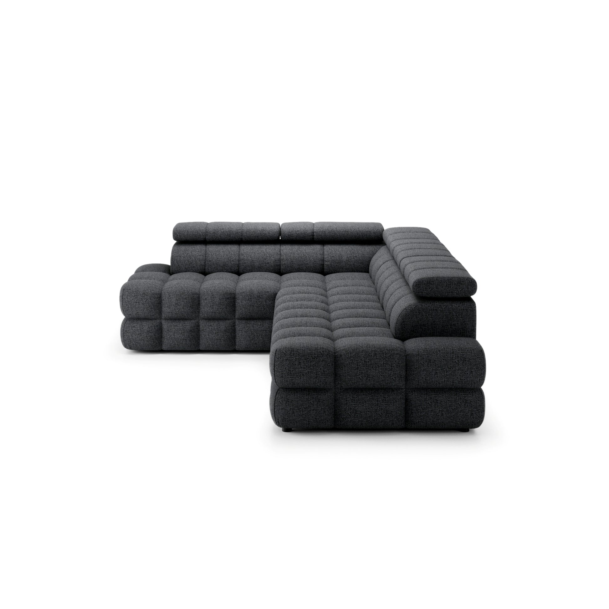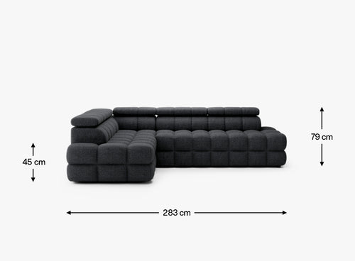 Przemyślany układ bryły (212 cm głębokości oraz 283 cm szerokości) sprawia, że narożnik harmonijnie wypełnia przestrzeń, stając się jej dominującym, ale eleganckim elementem. Siedzisko o wysokości 45 cm oraz zmienna wysokość korpusu (79–101 cm z uniesionymi zagłówkami) nadają całości nowoczesny, przytulny charakter.