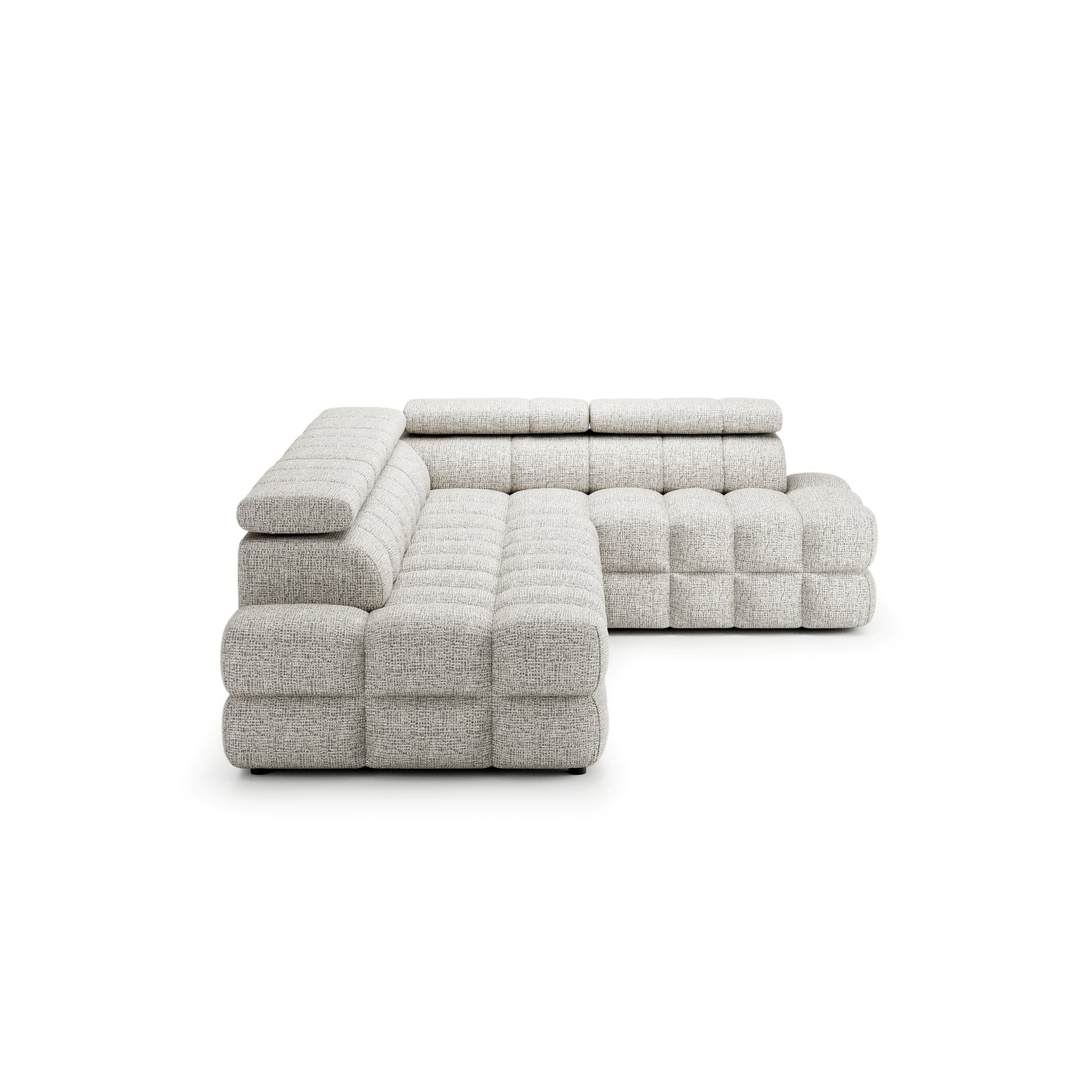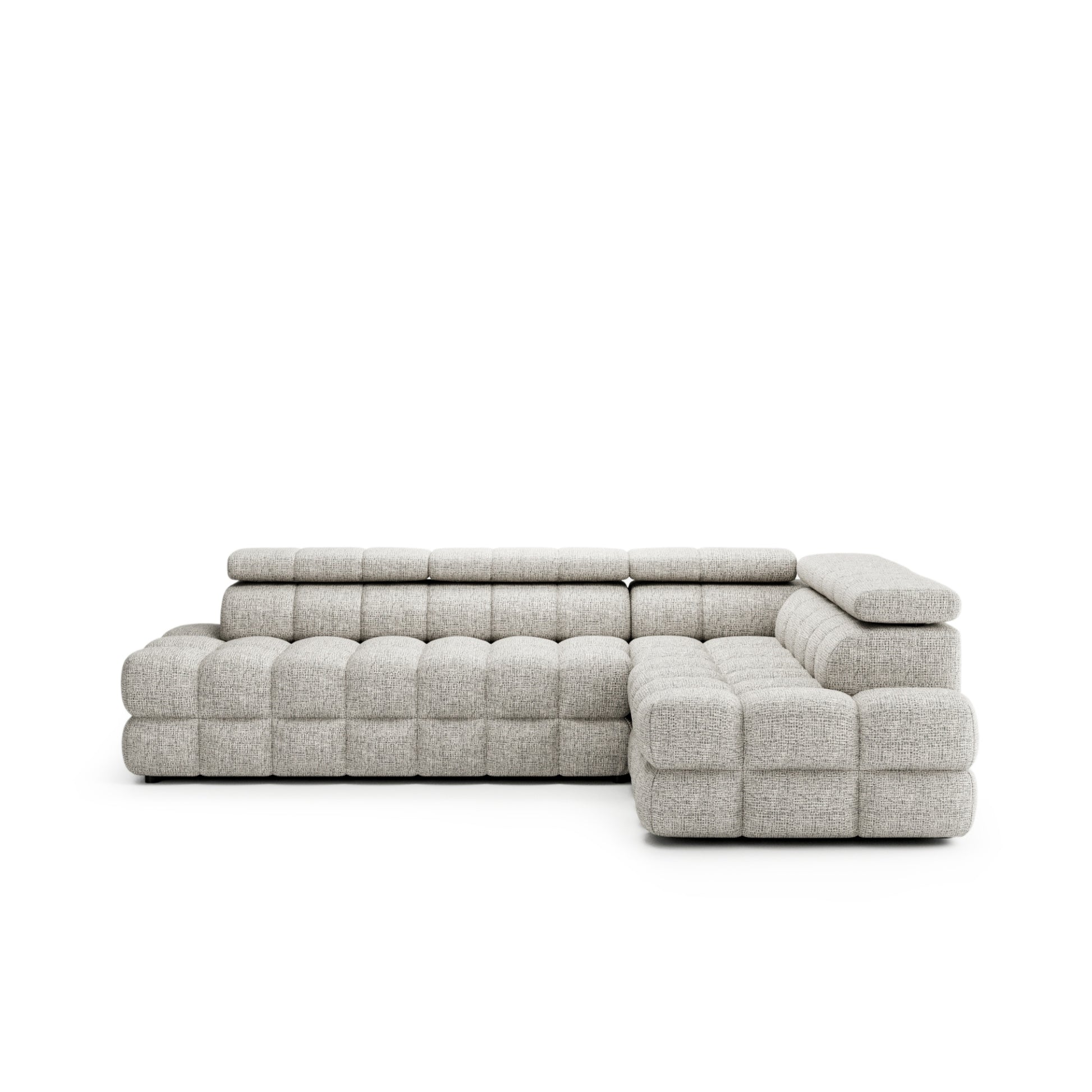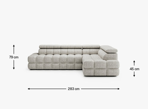 Przemyślany układ bryły (212 cm głębokości oraz 283 cm szerokości) sprawia, że narożnik harmonijnie wypełnia przestrzeń, stając się jej dominującym, ale eleganckim elementem. Siedzisko o wysokości 45 cm oraz zmienna wysokość korpusu (79–101 cm z uniesionymi zagłówkami) nadają całości nowoczesny, przytulny charakter.