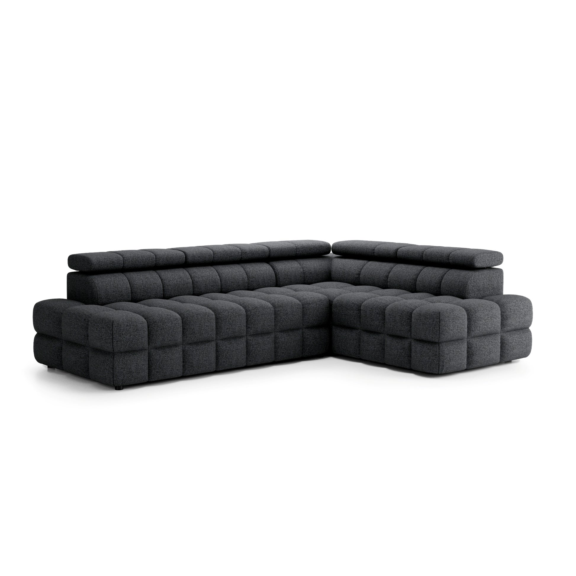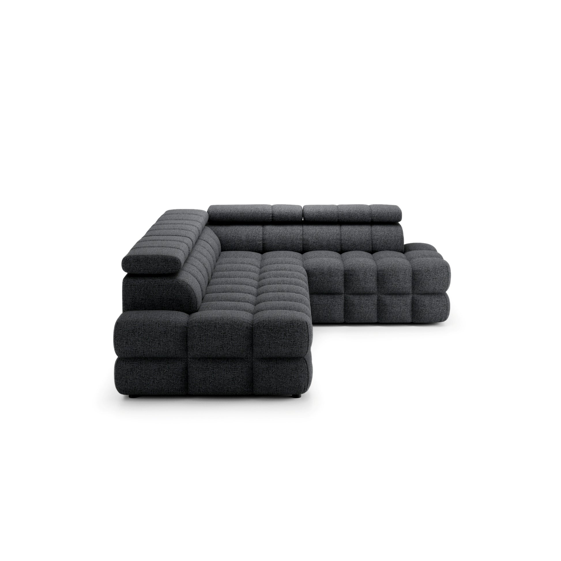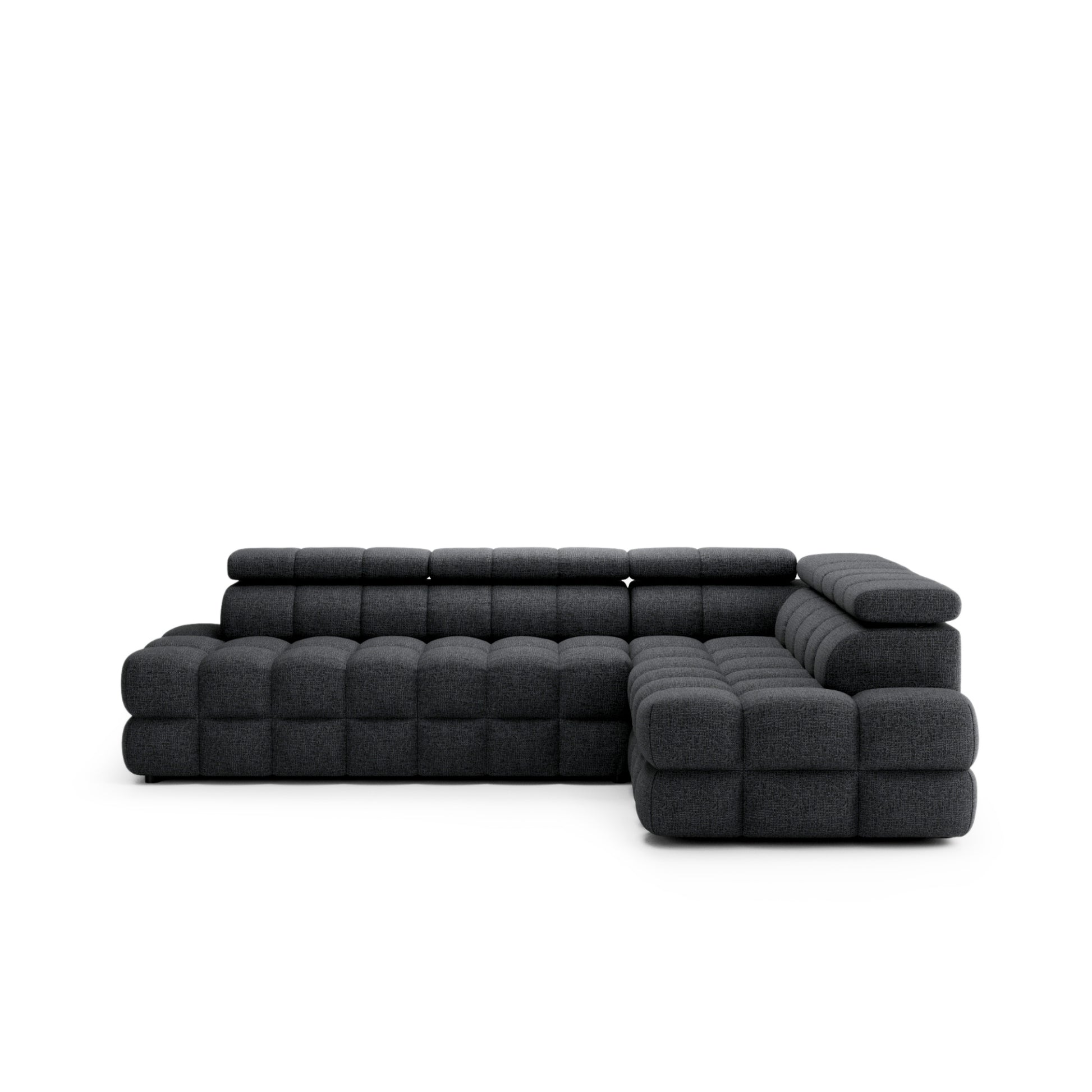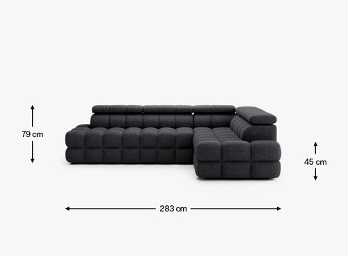 Przemyślany układ bryły (212 cm głębokości oraz 283 cm szerokości) sprawia, że narożnik harmonijnie wypełnia przestrzeń, stając się jej dominującym, ale eleganckim elementem. Siedzisko o wysokości 45 cm oraz zmienna wysokość korpusu (79–101 cm z uniesionymi zagłówkami) nadają całości nowoczesny, przytulny charakter.