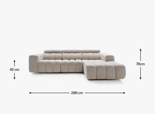 With a wide seat (225 cm) and an ergonomic profile (depth 64 cm, height 42 cm), the Zürich provides everyday comfort and space for relaxation in any situation. Comfort is further enhanced by the use of high-resilience HR foam, supported by sinuous springs and sturdy upholstery straps.