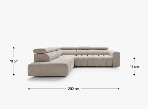 Height-adjustable headrests allow you to adjust the position to your preferences—from comfortable conversation to relaxing in a semi-reclined position. The entire piece rests on elegant, low legs (3 cm), which add a touch of lightness to the 292 x 219 cm design.