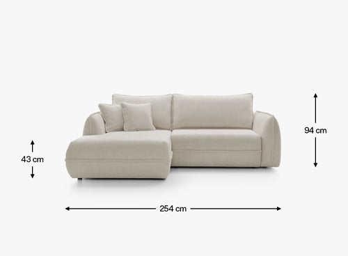 Dzięki szerokości 254 cm narożnik oferuje dużo miejsca do wypoczynku, a wygodna część narożna o głębokości 162 cm pozwala swobodnie się wyciągnąć i zrelaksować. Szerokość siedziska 195 cm oraz komfortowa głębokość do poduszki 63 cm zapewniają wygodę zarówno podczas siedzenia, jak i dłuższego odpoczynku. Miękkie oparcia i poduszki sprzyjają relaksowi i domowej atmosferze.
