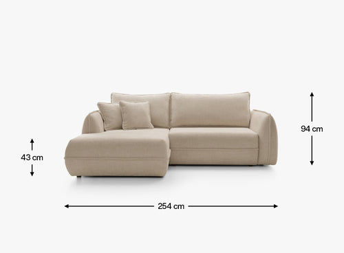 Dzięki szerokości 254 cm narożnik oferuje dużo miejsca do wypoczynku, a wygodna część narożna o głębokości 162 cm pozwala swobodnie się wyciągnąć i zrelaksować. Szerokość siedziska 195 cm oraz komfortowa głębokość do poduszki 63 cm zapewniają wygodę zarówno podczas siedzenia, jak i dłuższego odpoczynku. Miękkie oparcia i poduszki sprzyjają relaksowi i domowej atmosferze.