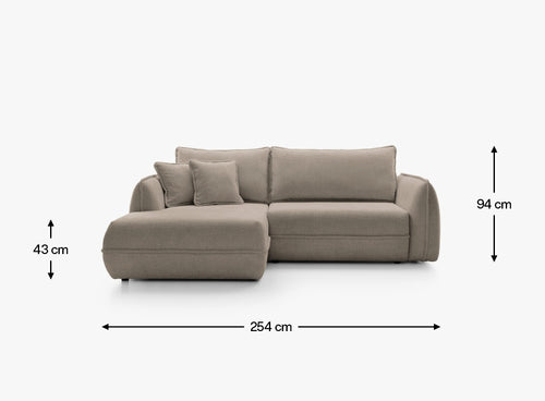 Dzięki szerokości 254 cm narożnik oferuje dużo miejsca do wypoczynku, a wygodna część narożna o głębokości 162 cm pozwala swobodnie się wyciągnąć i zrelaksować. Szerokość siedziska 195 cm oraz komfortowa głębokość do poduszki 63 cm zapewniają wygodę zarówno podczas siedzenia, jak i dłuższego odpoczynku. Miękkie oparcia i poduszki sprzyjają relaksowi i domowej atmosferze.