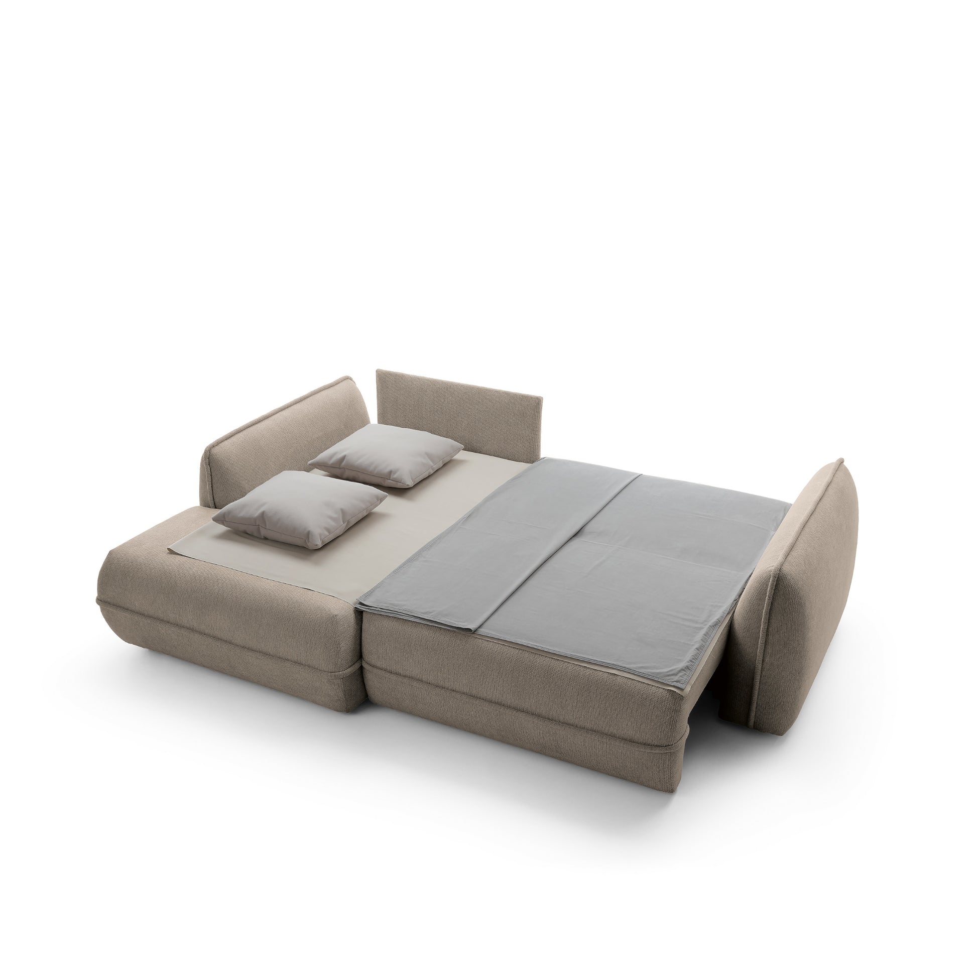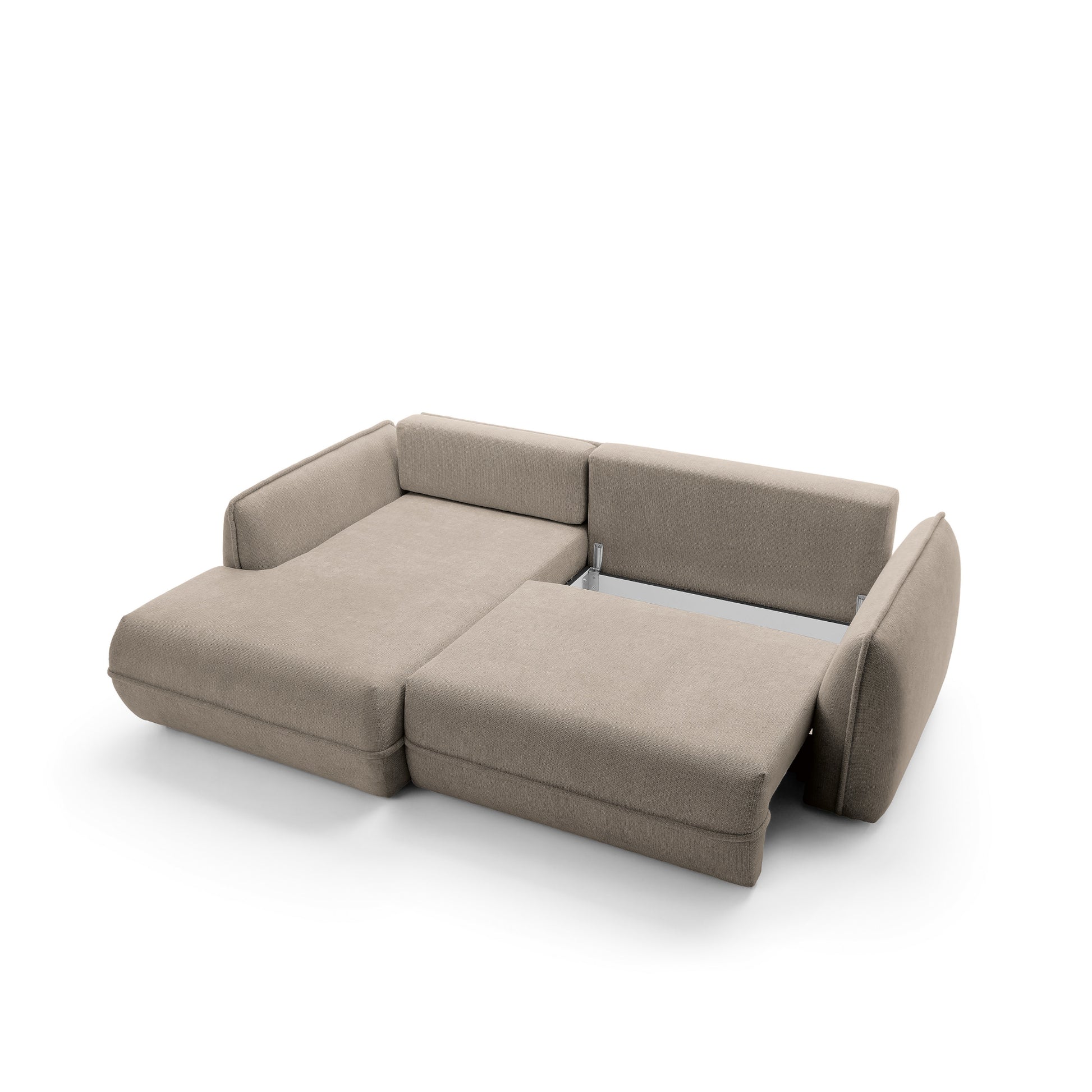 Moho to nie tylko estetyka, ale również funkcjonalność. Dzięki funkcji spania narożnik w prosty sposób zamienia się w wygodne miejsce do snu o powierzchni 195 × 145 cm, idealne dla gości lub do okazjonalnego noclegu. Pojemnik na pościel umożliwia praktyczne przechowywanie kołder i poduszek, pomagając utrzymać porządek w salonie.