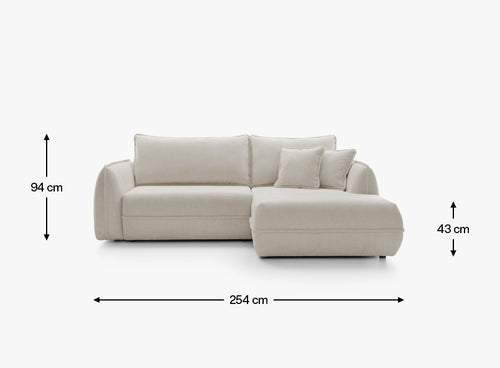Dzięki szerokości 254 cm narożnik oferuje dużo miejsca do wypoczynku, a wygodna część narożna o głębokości 162 cm pozwala swobodnie się wyciągnąć i zrelaksować. Szerokość siedziska 195 cm oraz komfortowa głębokość do poduszki 63 cm zapewniają wygodę zarówno podczas siedzenia, jak i dłuższego odpoczynku. Miękkie oparcia i poduszki sprzyjają relaksowi i domowej atmosferze.