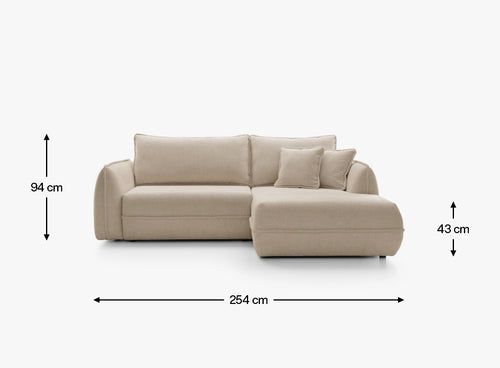 Dzięki szerokości 254 cm narożnik oferuje dużo miejsca do wypoczynku, a wygodna część narożna o głębokości 162 cm pozwala swobodnie się wyciągnąć i zrelaksować. Szerokość siedziska 195 cm oraz komfortowa głębokość do poduszki 63 cm zapewniają wygodę zarówno podczas siedzenia, jak i dłuższego odpoczynku. Miękkie oparcia i poduszki sprzyjają relaksowi i domowej atmosferze.