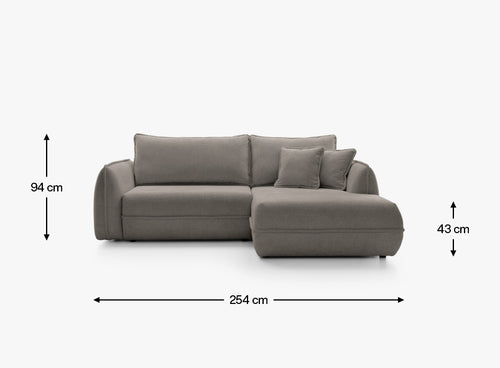 Dzięki szerokości 254 cm narożnik oferuje dużo miejsca do wypoczynku, a wygodna część narożna o głębokości 162 cm pozwala swobodnie się wyciągnąć i zrelaksować. Szerokość siedziska 195 cm oraz komfortowa głębokość do poduszki 63 cm zapewniają wygodę zarówno podczas siedzenia, jak i dłuższego odpoczynku. Miękkie oparcia i poduszki sprzyjają relaksowi i domowej atmosferze.