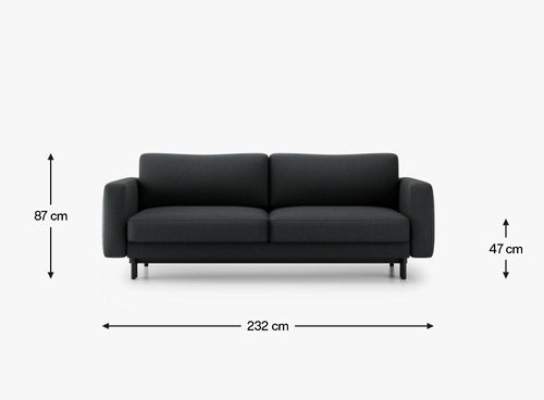Its hidden sleeping function allows for an instant transformation – from an elegant sofa to a comfortable bed. The spacious bedding storage is a clever solution for contemporary interiors, where every item should have its place. High legs add a touch of lightness to the form and make the piece appear to float above the floor, while also making it easier to keep things tidy.