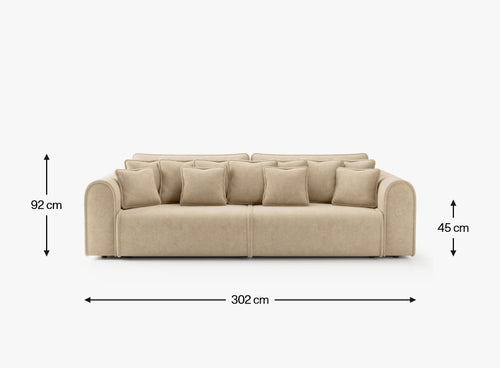 Big Buddy – a sofa with a sleeping function and storage compartment – combines modern design , maximum functionality , and exceptional comfort . Its monumental form (302 cm wide) immediately catches the eye, while the rounded shapes and vertical stitching give it a stylish, cozy character. Upholstered in Cloud fabric – a fabric with high abrasion resistance ( 90,000–100,000 Martindale cycles ) and easy cleaning – it is perfect for everyday use.