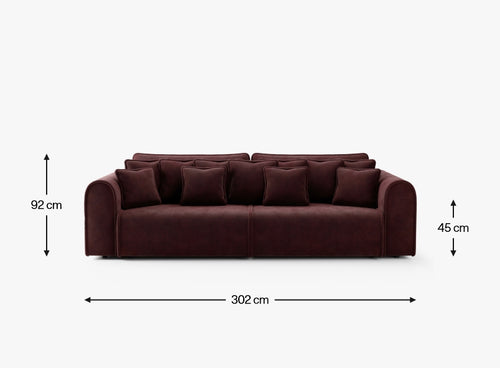 Big Buddy – a sofa with a sleeping function and storage compartment – combines modern design , maximum functionality , and exceptional comfort . Its monumental form (302 cm wide) immediately catches the eye, while the rounded shapes and vertical stitching give it a stylish, cozy character. Upholstered in Cloud fabric – a fabric with high abrasion resistance ( 90,000–100,000 Martindale cycles ) and easy cleaning – it is perfect for everyday use.