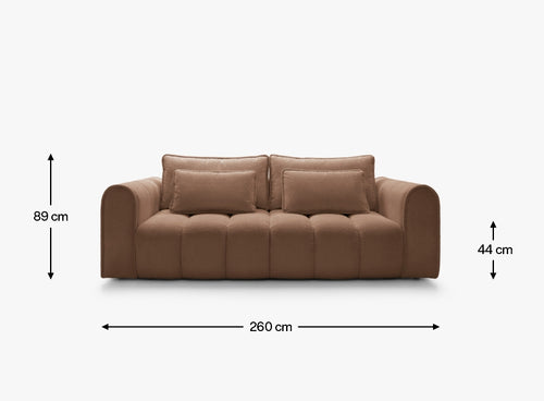 This massive 260 cm sofa impresses with its rounded contours and vertical stitching, bringing a modern softness and coziness to any interior. Upholstered in Rebel fabric – soft to the touch and abrasion-resistant (80,000 Martindale cycles) – it combines elegance with functionality.