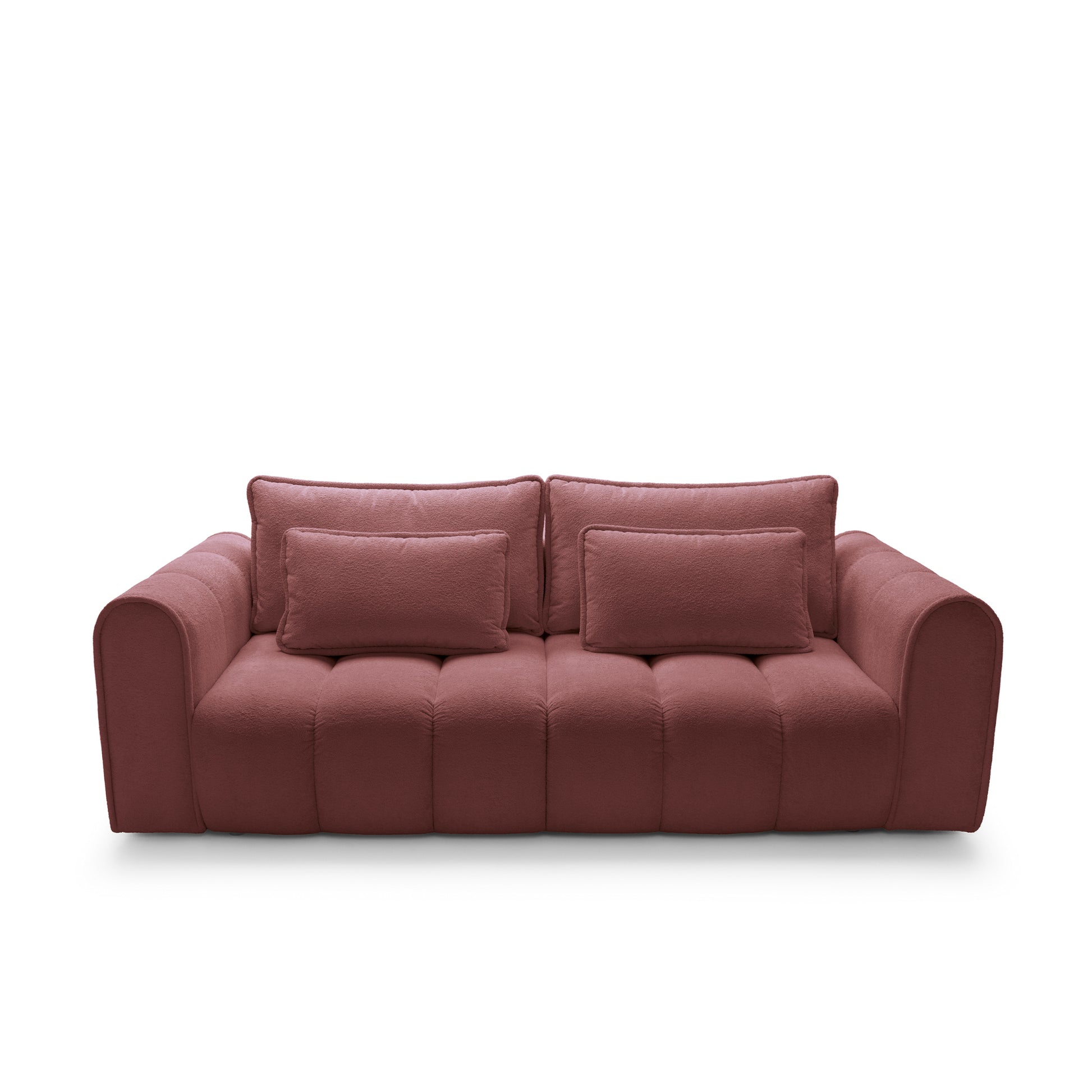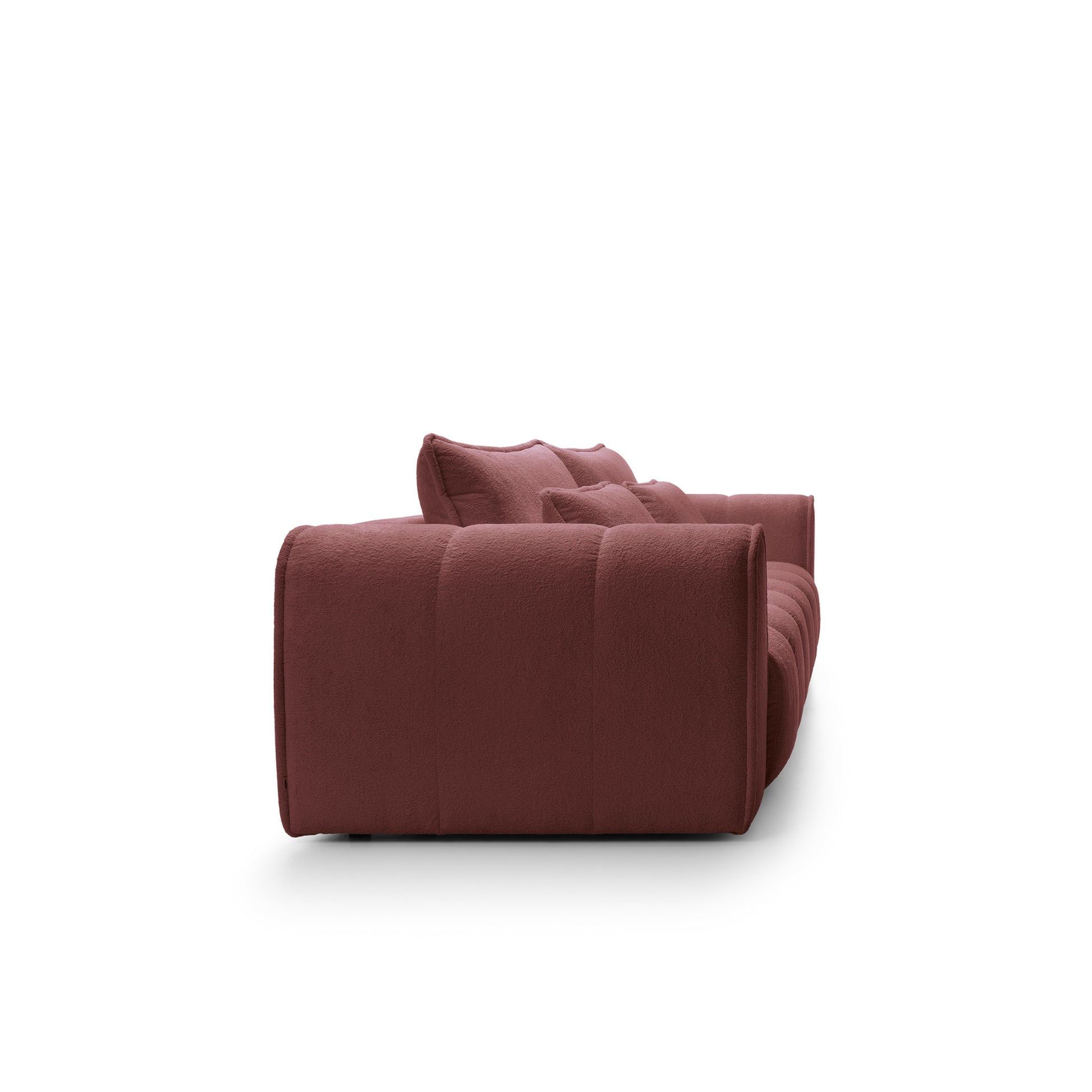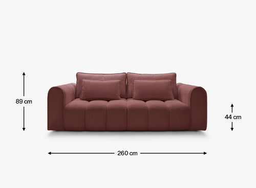 This massive 260 cm sofa impresses with its rounded contours and vertical stitching, bringing a modern softness and coziness to any interior. Upholstered in Rebel fabric – soft to the touch and abrasion-resistant (80,000 Martindale cycles) – it combines elegance with functionality.
