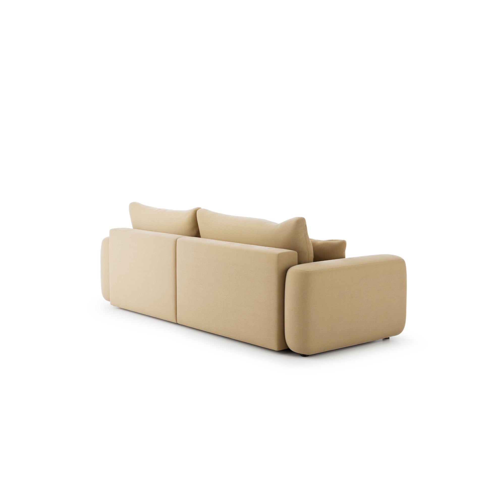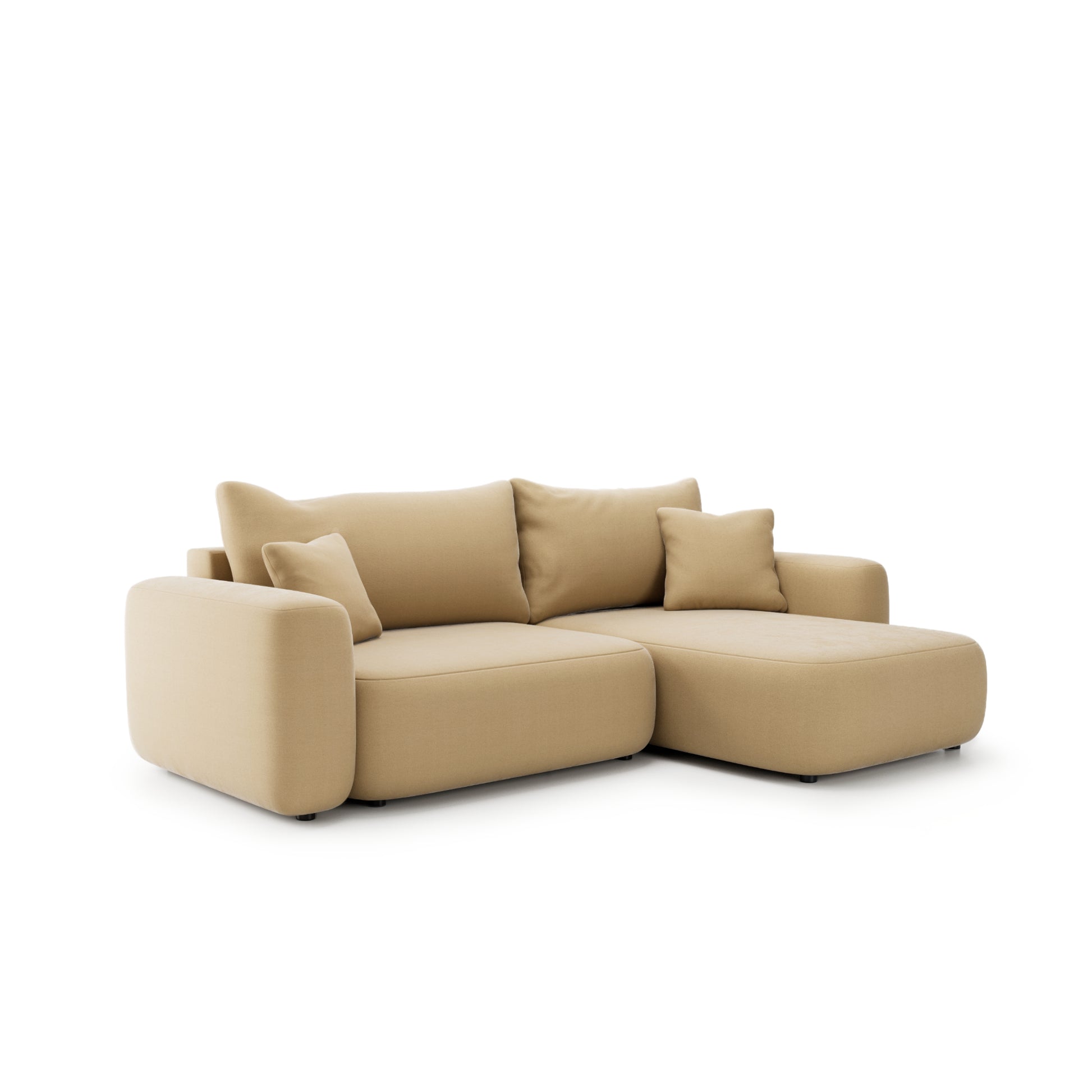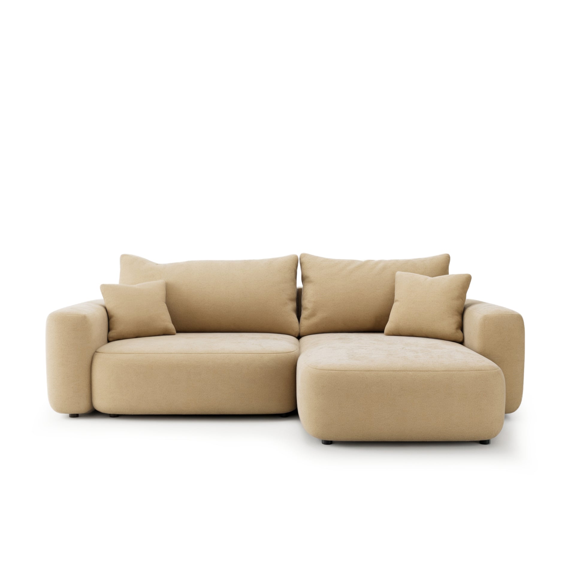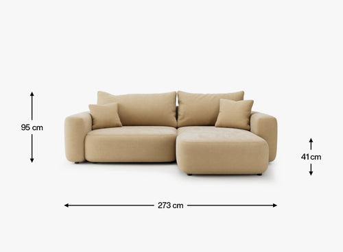 Szerokie siedziska o głębokości 63 cm i miękkie oparcia zapewniają komfort na najwyższym poziomie – idealny zarówno do popołudniowego odpoczynku, jak i długich wieczorów w gronie najbliższych. Dzięki funkcji spania narożnik w kilka chwil zamienia się w wygodne łóżko o powierzchni 216 × 134 cm, a praktyczny pojemnik na pościel pozwala zachować porządek i maksymalnie wykorzystać przestrzeń.