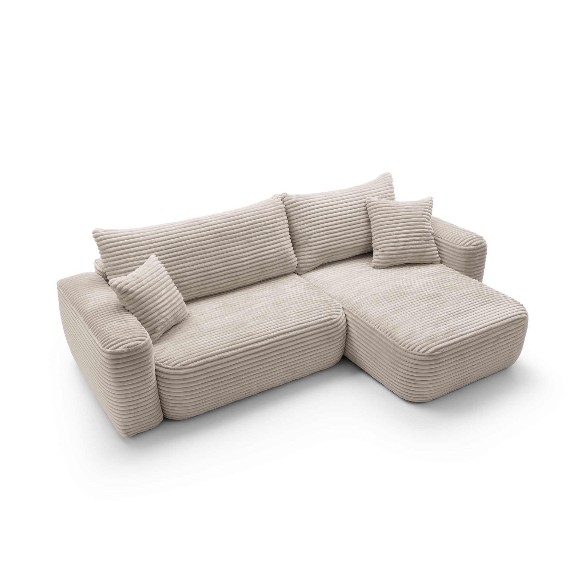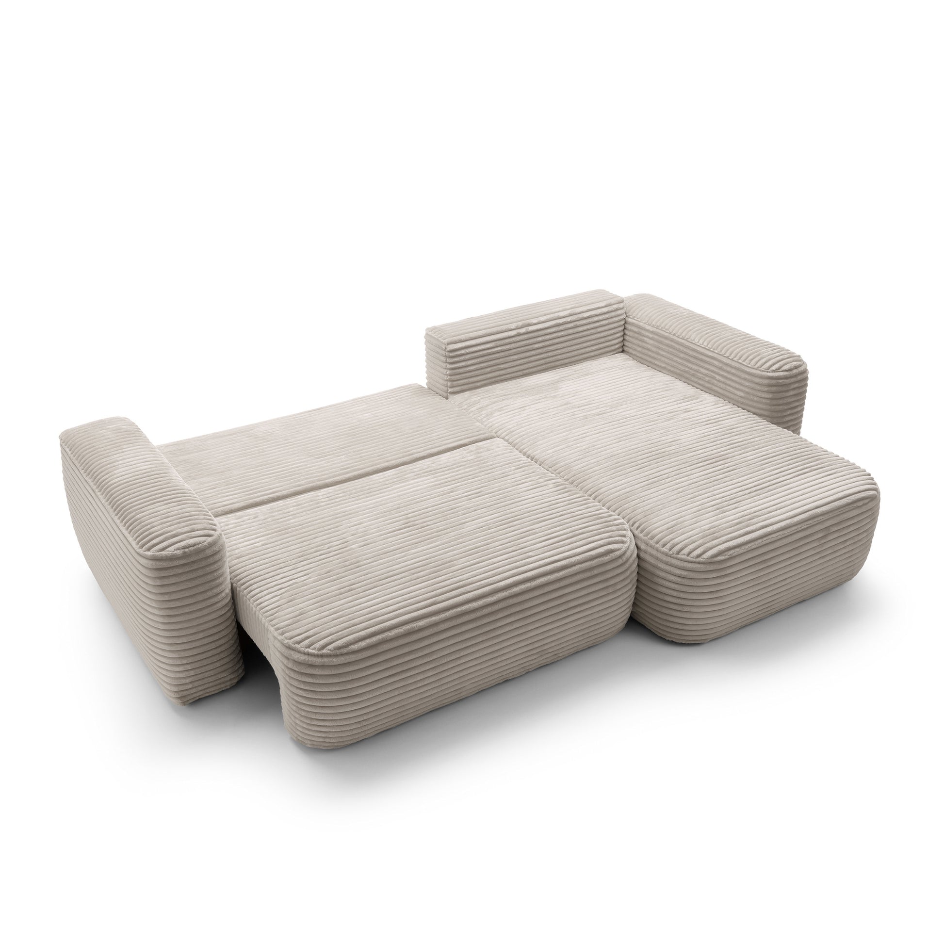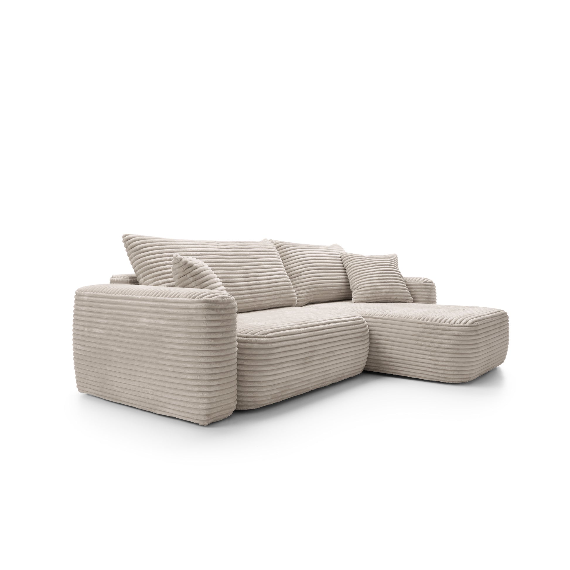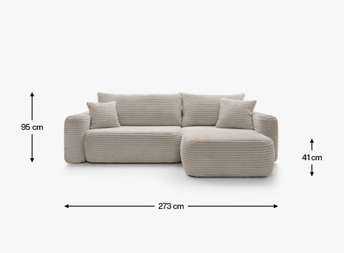 Szerokie siedziska o głębokości 63 cm i miękkie oparcia zapewniają komfort na najwyższym poziomie – idealny zarówno do popołudniowego odpoczynku, jak i długich wieczorów w gronie najbliższych. Dzięki funkcji spania narożnik w kilka chwil zamienia się w wygodne łóżko o powierzchni 216 × 134 cm, a praktyczny pojemnik na pościel pozwala zachować porządek i maksymalnie wykorzystać przestrzeń.