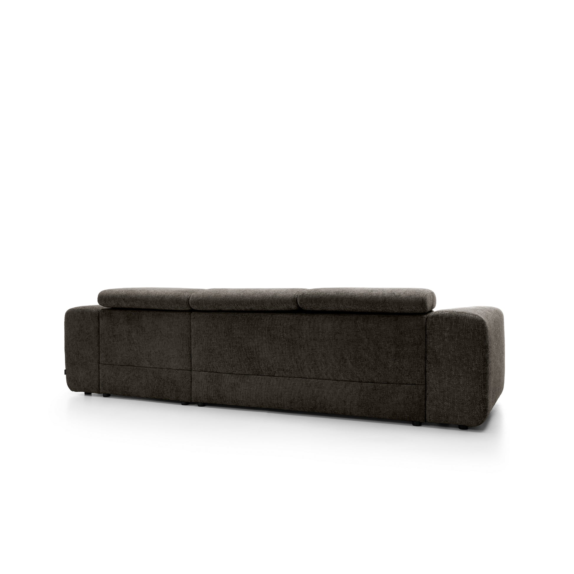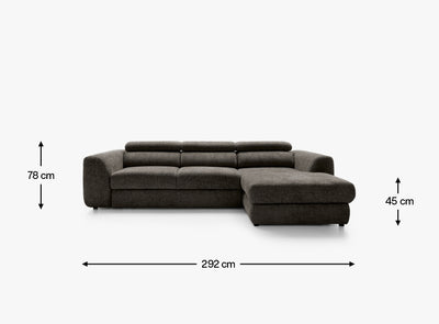 Wymiary całkowite mebla – 292 cm szerokości, 78 cm wysokości (99 cm z podniesionymi zagłówkami) i 112 cm głębokości – czynią z niego centralny punkt każdego wnętrza. Nogi o wysokości 3 cm nadają lekkości, a subtelnie zaokrąglone podłokietniki (65 cm wysokości) wprowadzają przytulny akcent do jego nowoczesnego wyglądu.