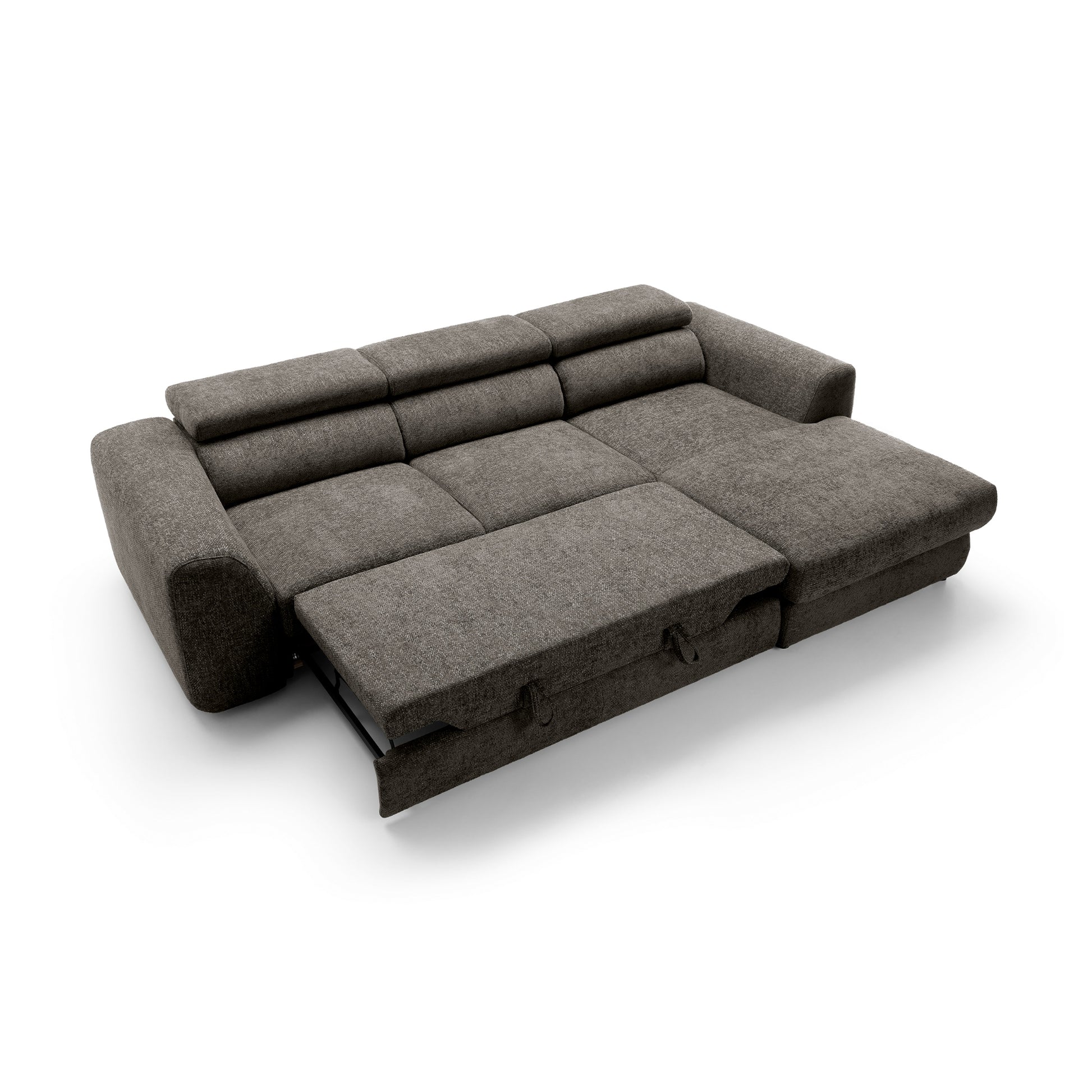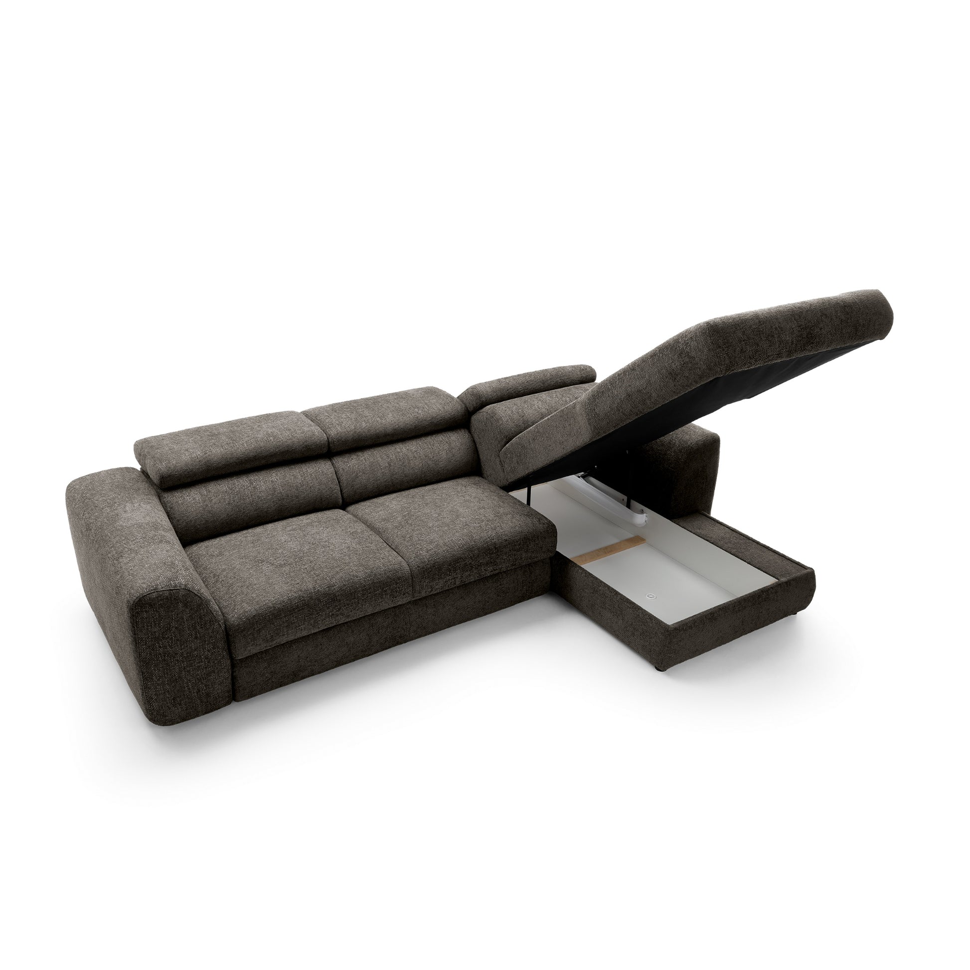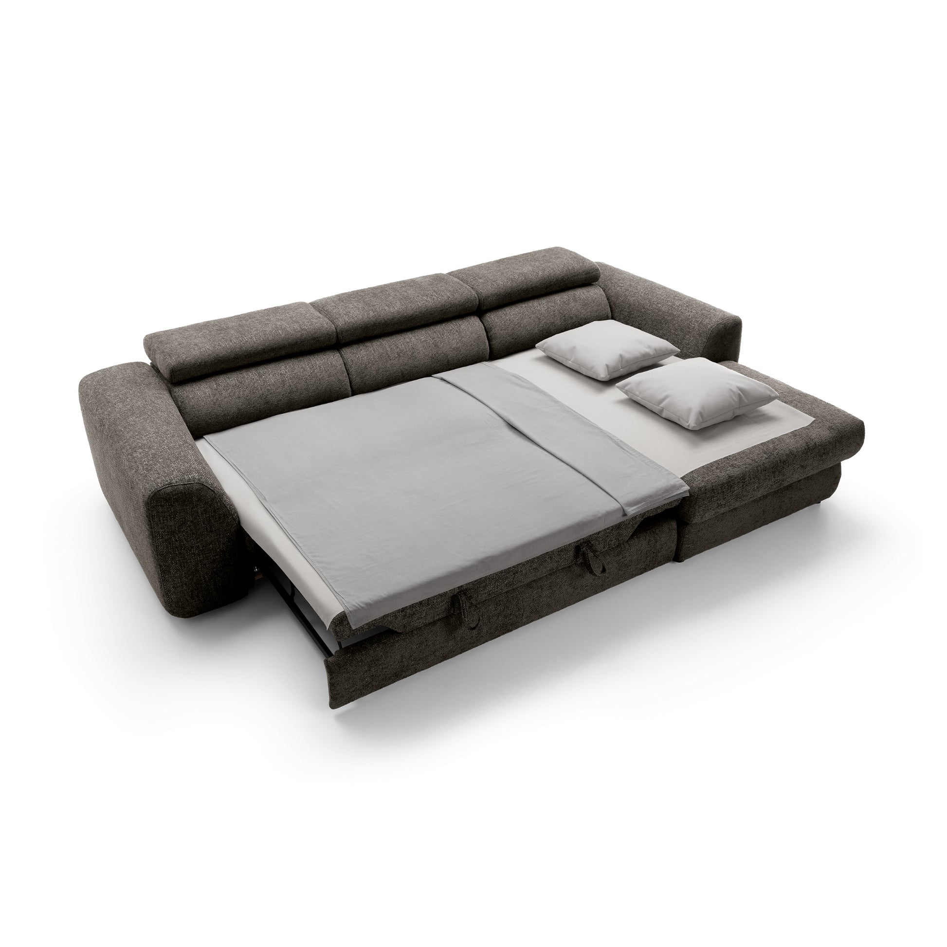 Bluvel I to nie tylko strefa wypoczynku – to także praktyczne rozwiązanie dla tych, którzy cenią funkcjonalność. Dzięki łatwemu w obsłudze mechanizmowi rozkładania narożnik w kilka chwil zamienia się w wygodne łóżko o powierzchni spania 225 × 128 cm. Dodatkowo wyposażony został w praktyczny pojemnik na pościel, który pomaga utrzymać porządek w salonie.