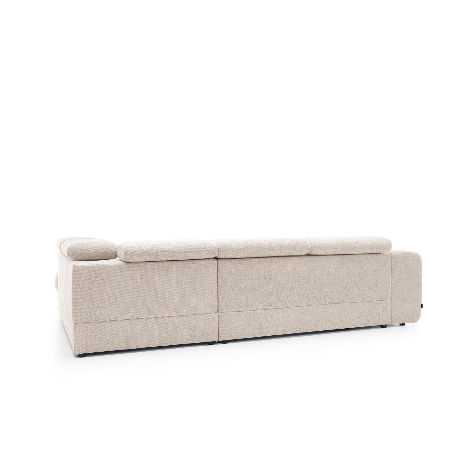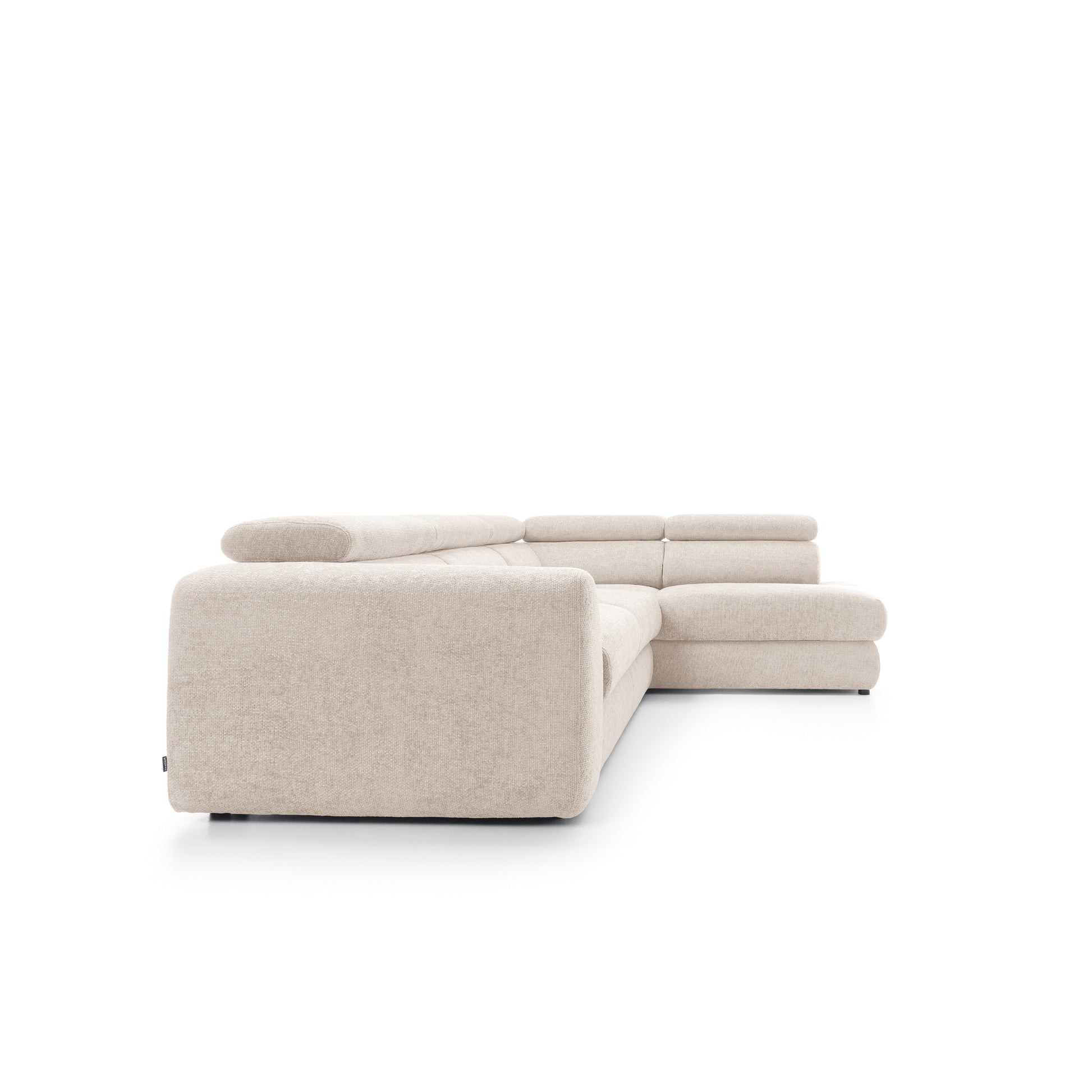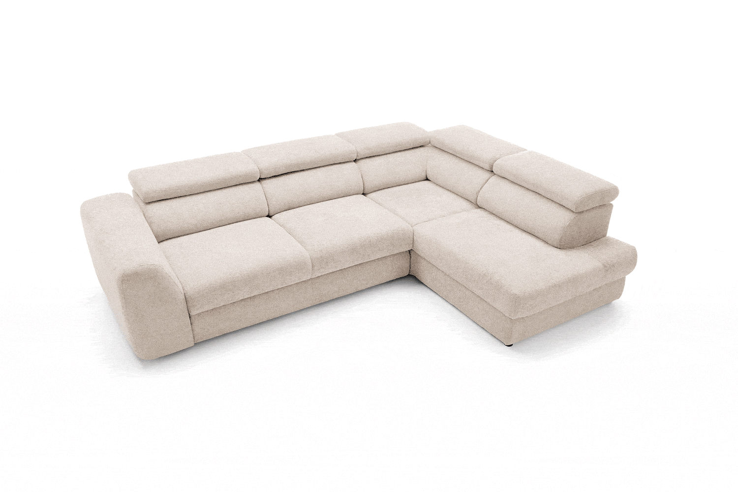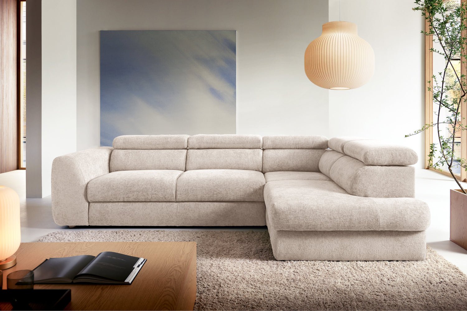Szerokie, miękkie siedziska i grube oparcia zapewniają wygodę niezależnie od pory dnia. Wydłużona część narożna (207 cm) umożliwia swobodne wyciągnięcie nóg i relaks w pozycji półleżącej. Dodatkowo, regulowane zagłówki pozwalają dopasować kąt podparcia do własnych preferencji – idealne na dłuższy odpoczynek, filmowy wieczór czy popołudniową drzemkę.