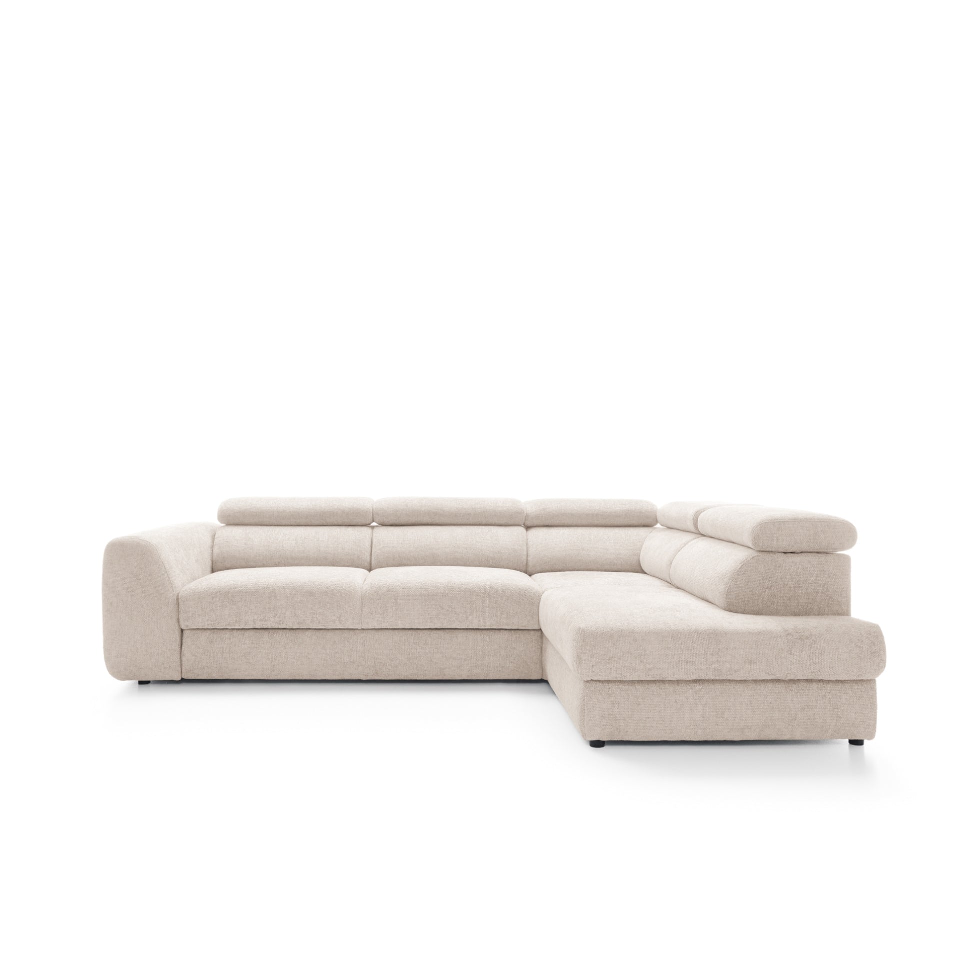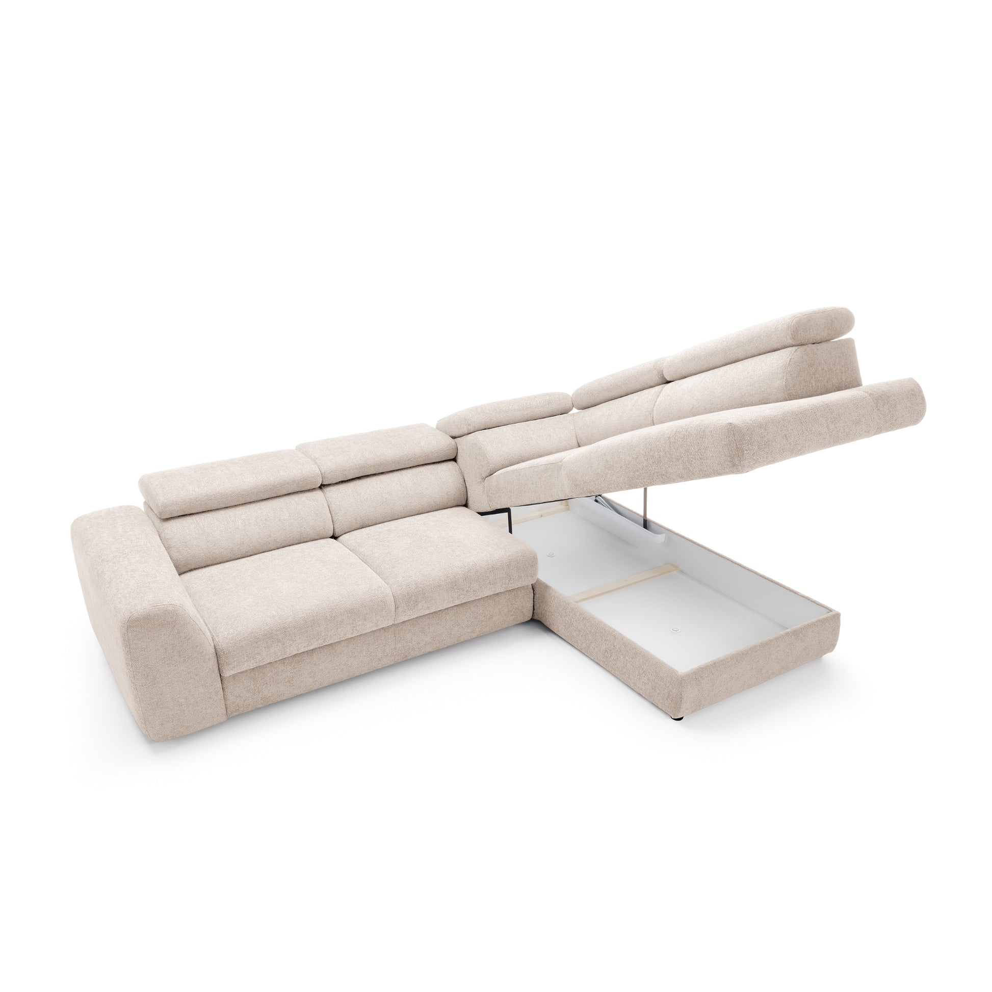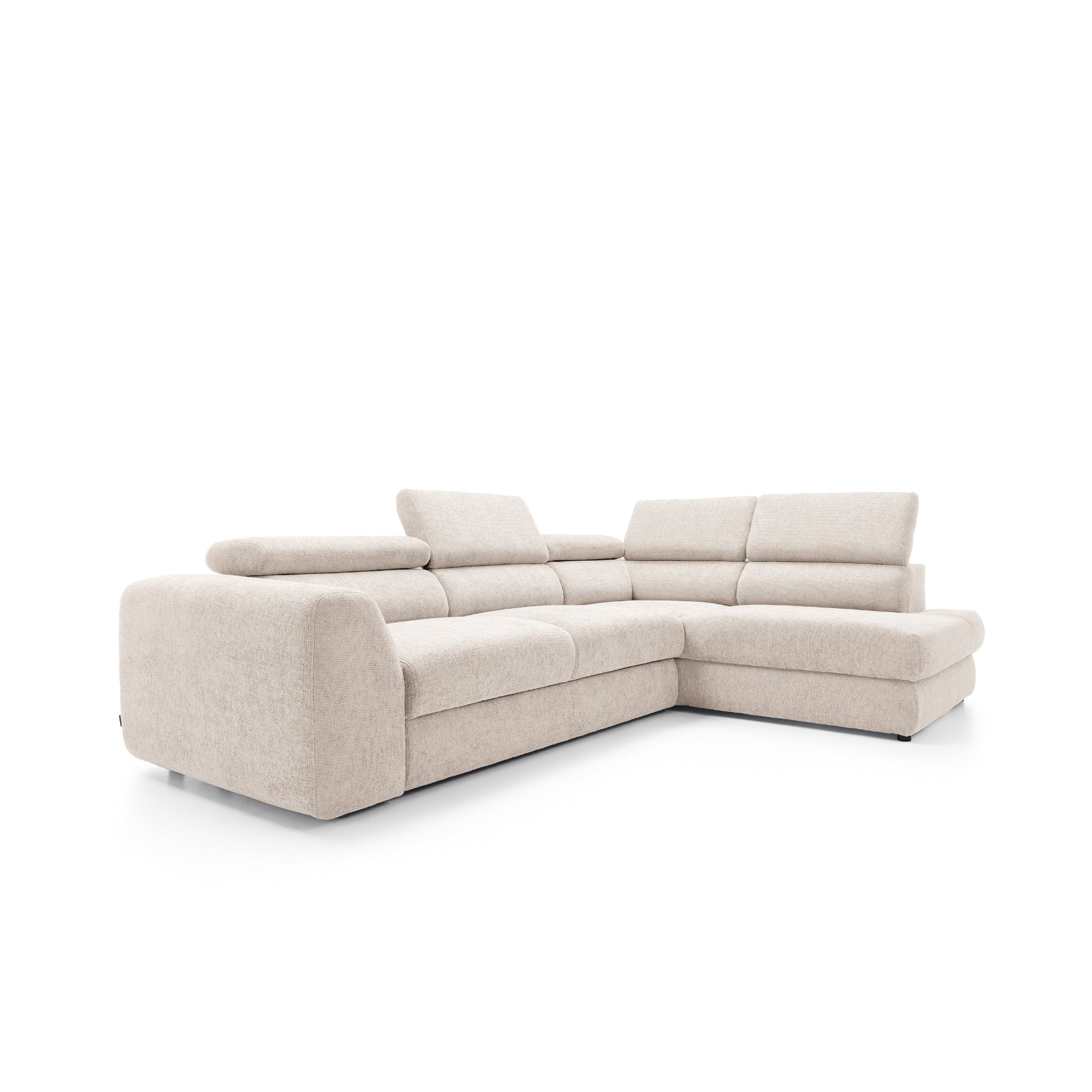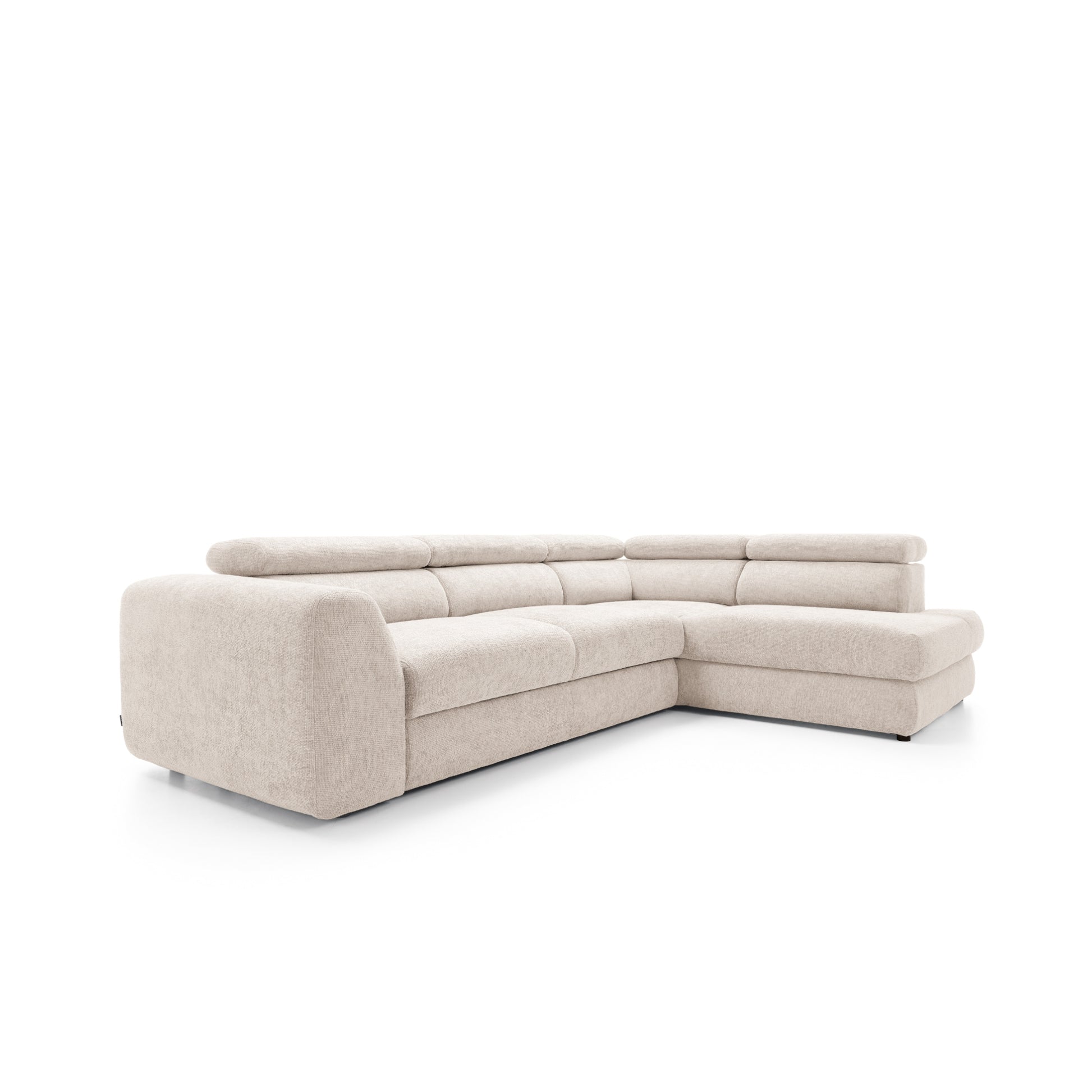 Szerokie, miękkie siedziska i grube oparcia zapewniają wygodę niezależnie od pory dnia. Wydłużona część narożna (207 cm) umożliwia swobodne wyciągnięcie nóg i relaks w pozycji półleżącej. Dodatkowo, regulowane zagłówki pozwalają dopasować kąt podparcia do własnych preferencji – idealne na dłuższy odpoczynek, filmowy wieczór czy popołudniową drzemkę.