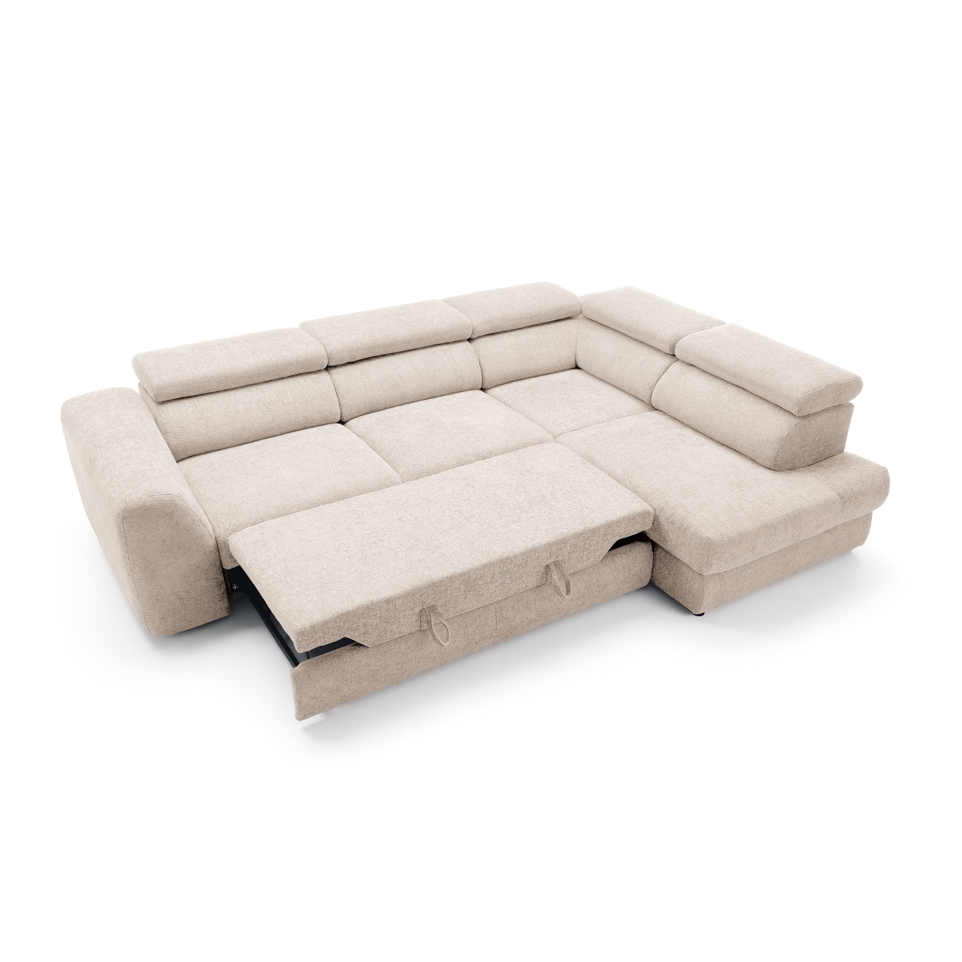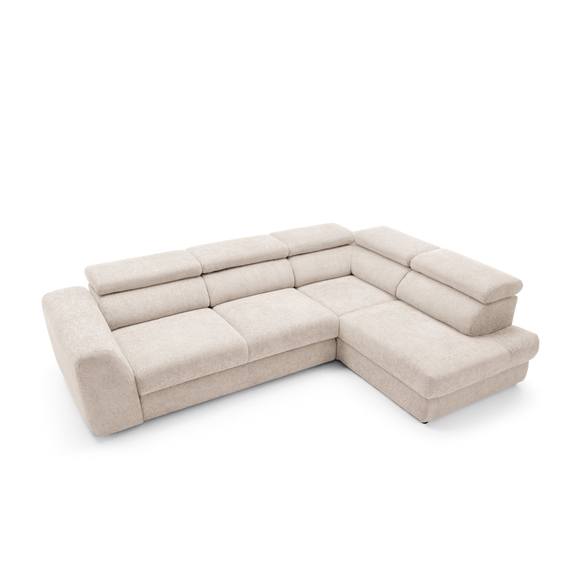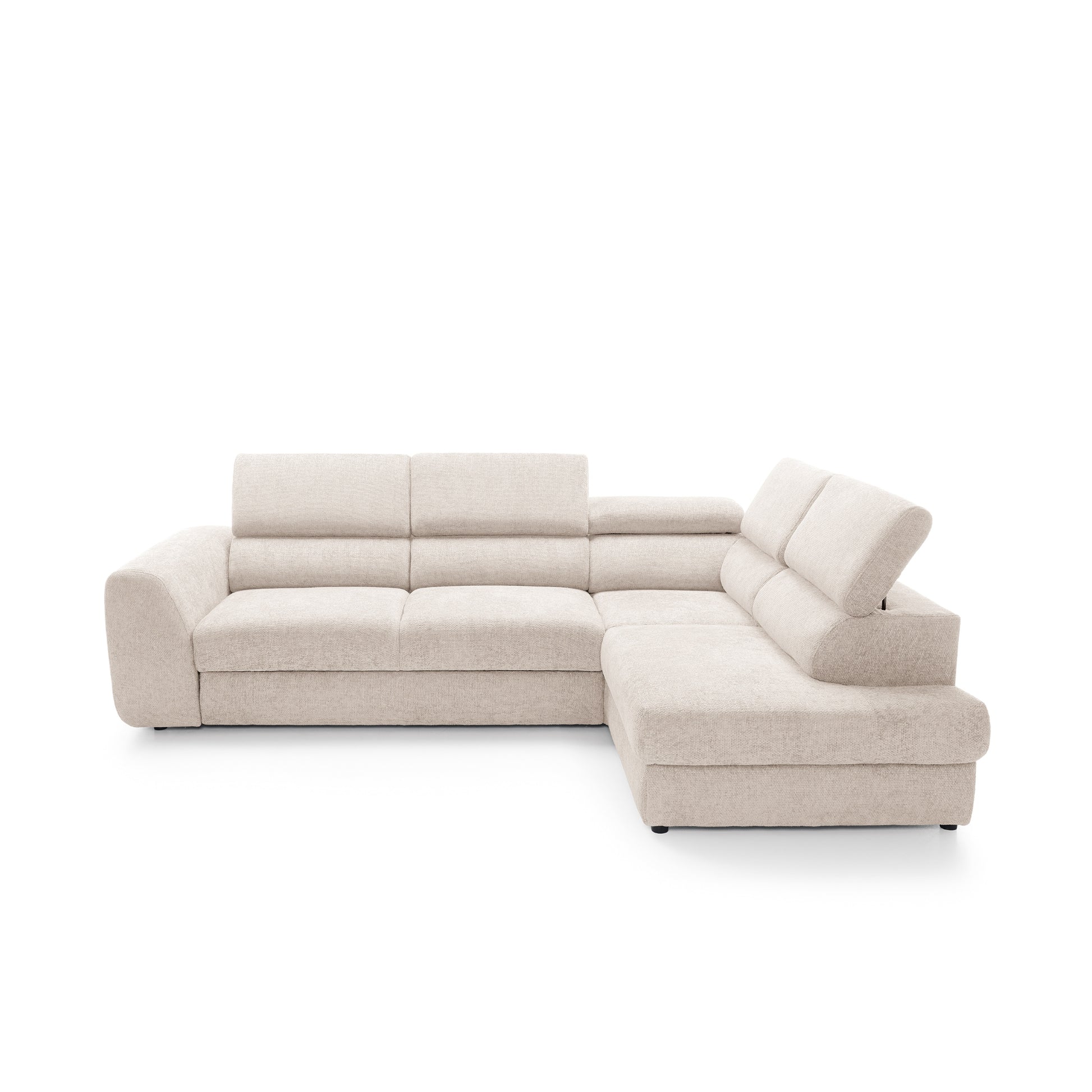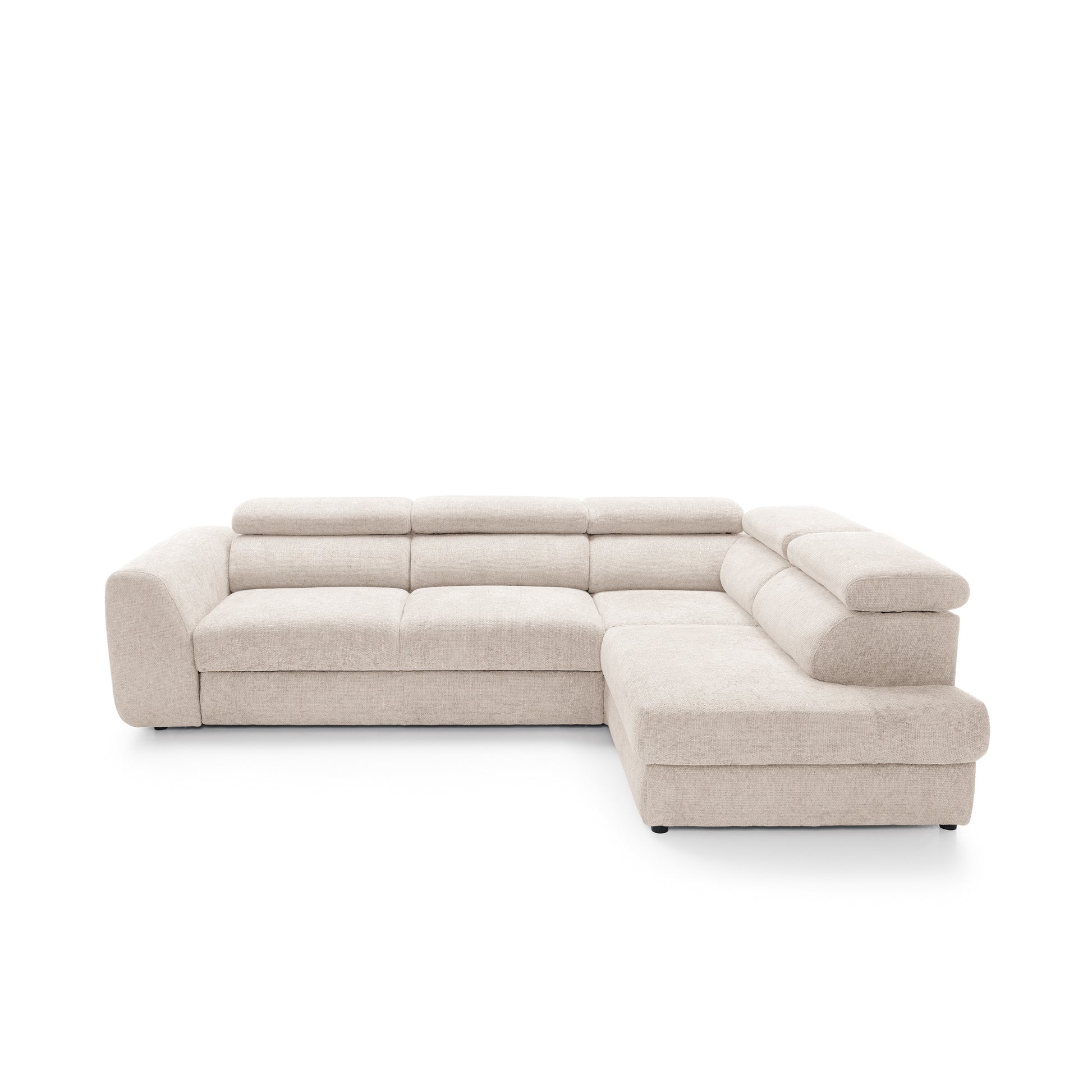 Szerokie, miękkie siedziska i grube oparcia zapewniają wygodę niezależnie od pory dnia. Wydłużona część narożna (207 cm) umożliwia swobodne wyciągnięcie nóg i relaks w pozycji półleżącej. Dodatkowo, regulowane zagłówki pozwalają dopasować kąt podparcia do własnych preferencji – idealne na dłuższy odpoczynek, filmowy wieczór czy popołudniową drzemkę.