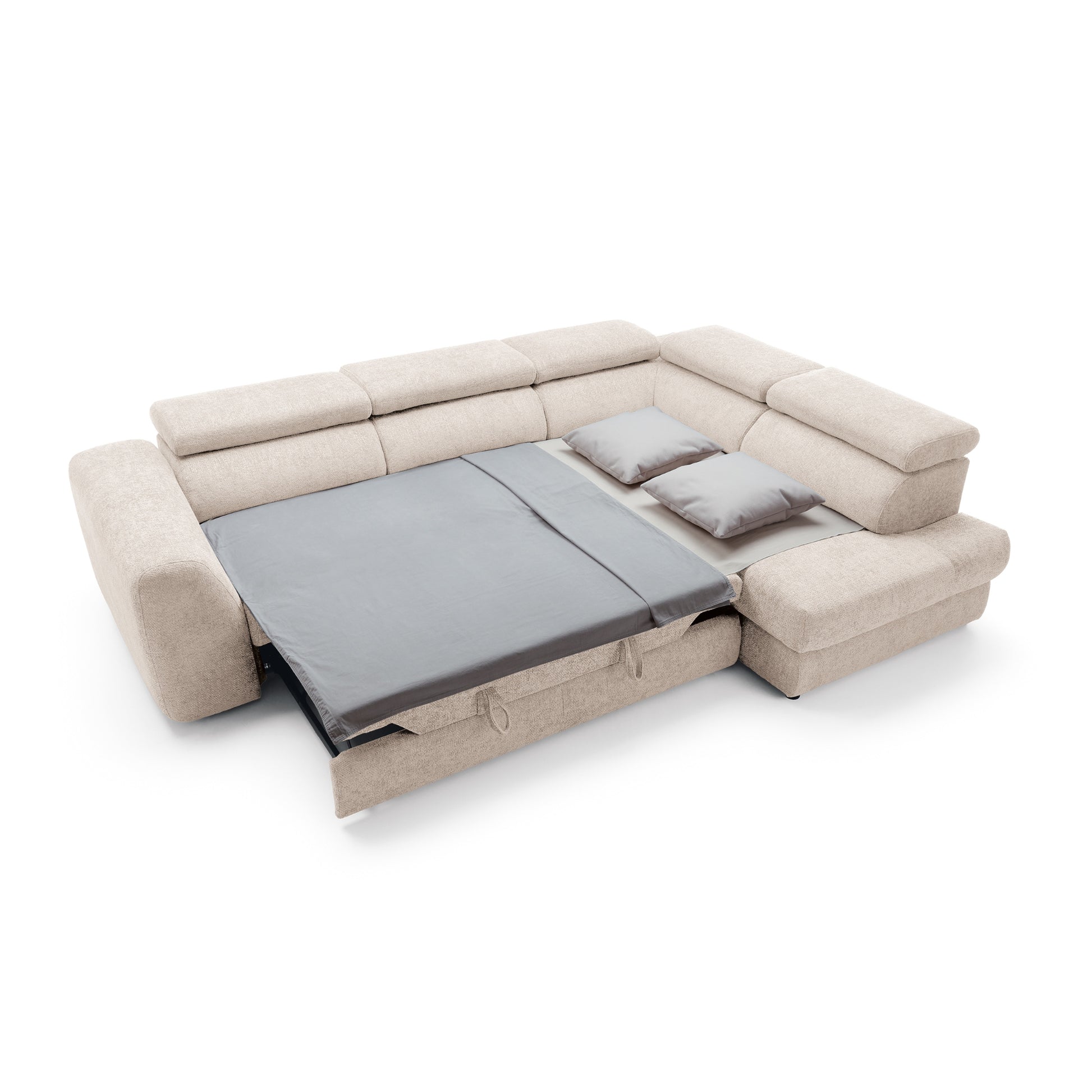 Z myślą o codziennej praktyczności, narożnik Bluvel II został wyposażony w funkcję spania – łatwy w obsłudze mechanizm rozkładania pozwala stworzyć wygodne łóżko o powierzchni 202 × 128 cm. Wbudowany pojemnik na pościel umożliwia wygodne przechowywanie koców i poduszek, pomagając utrzymać porządek.