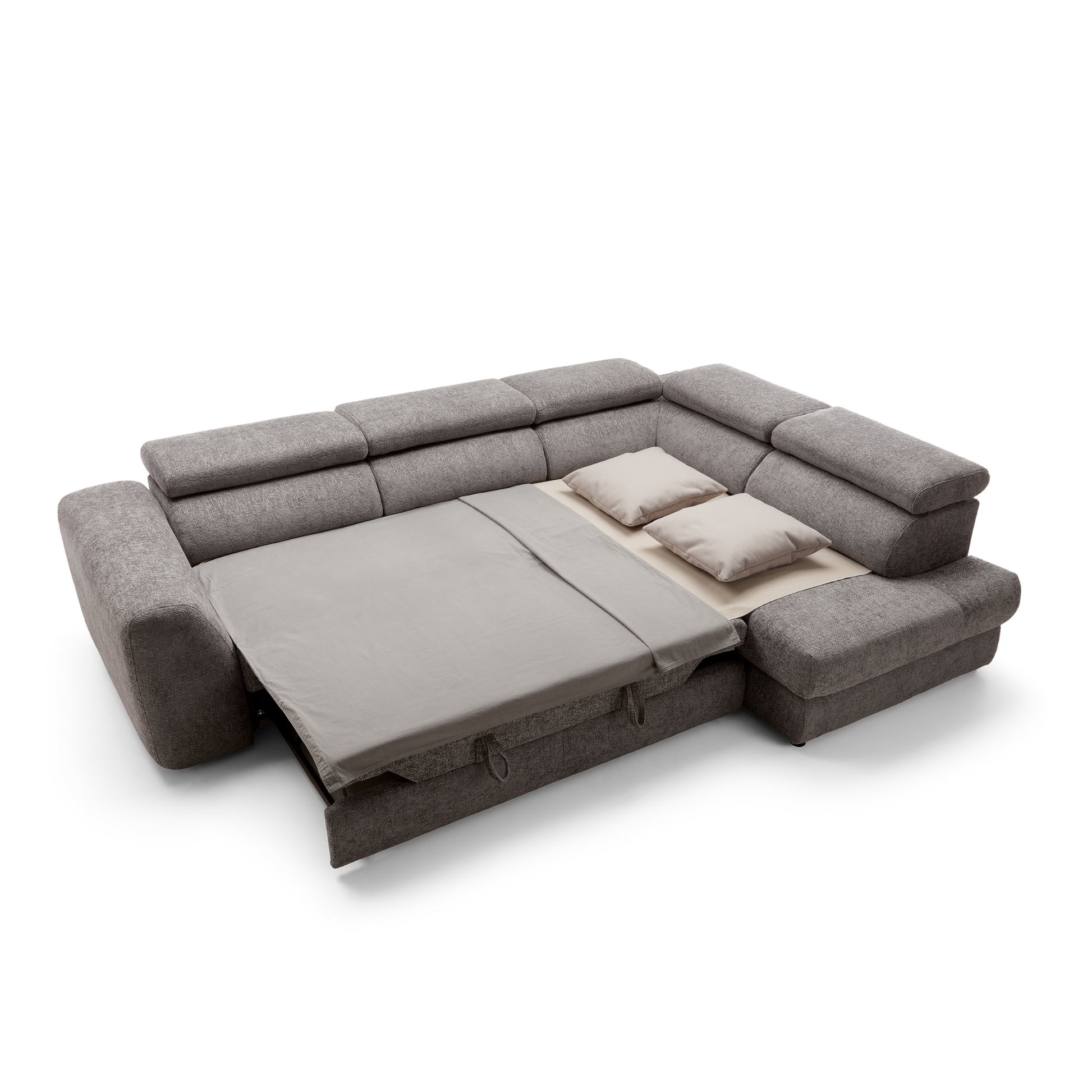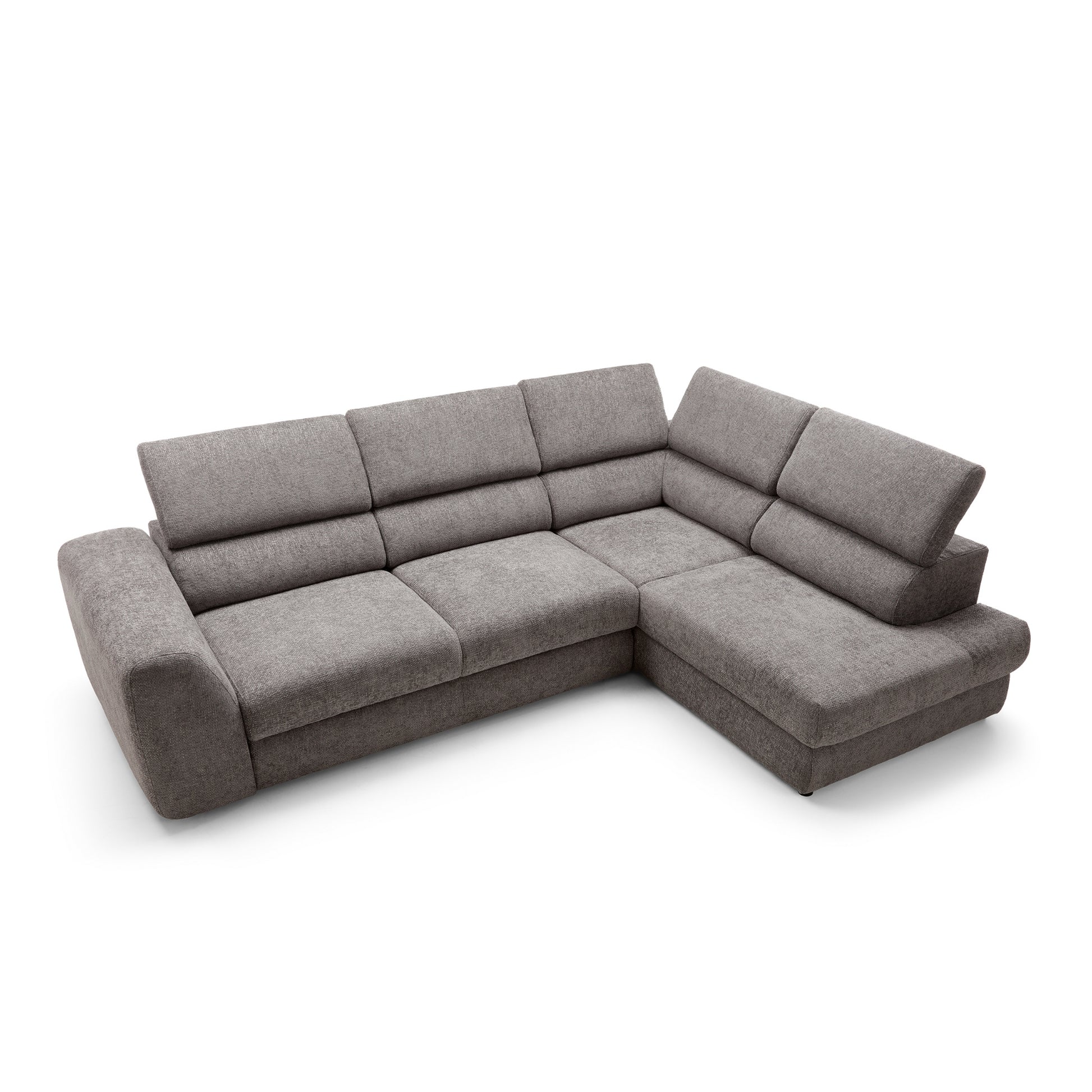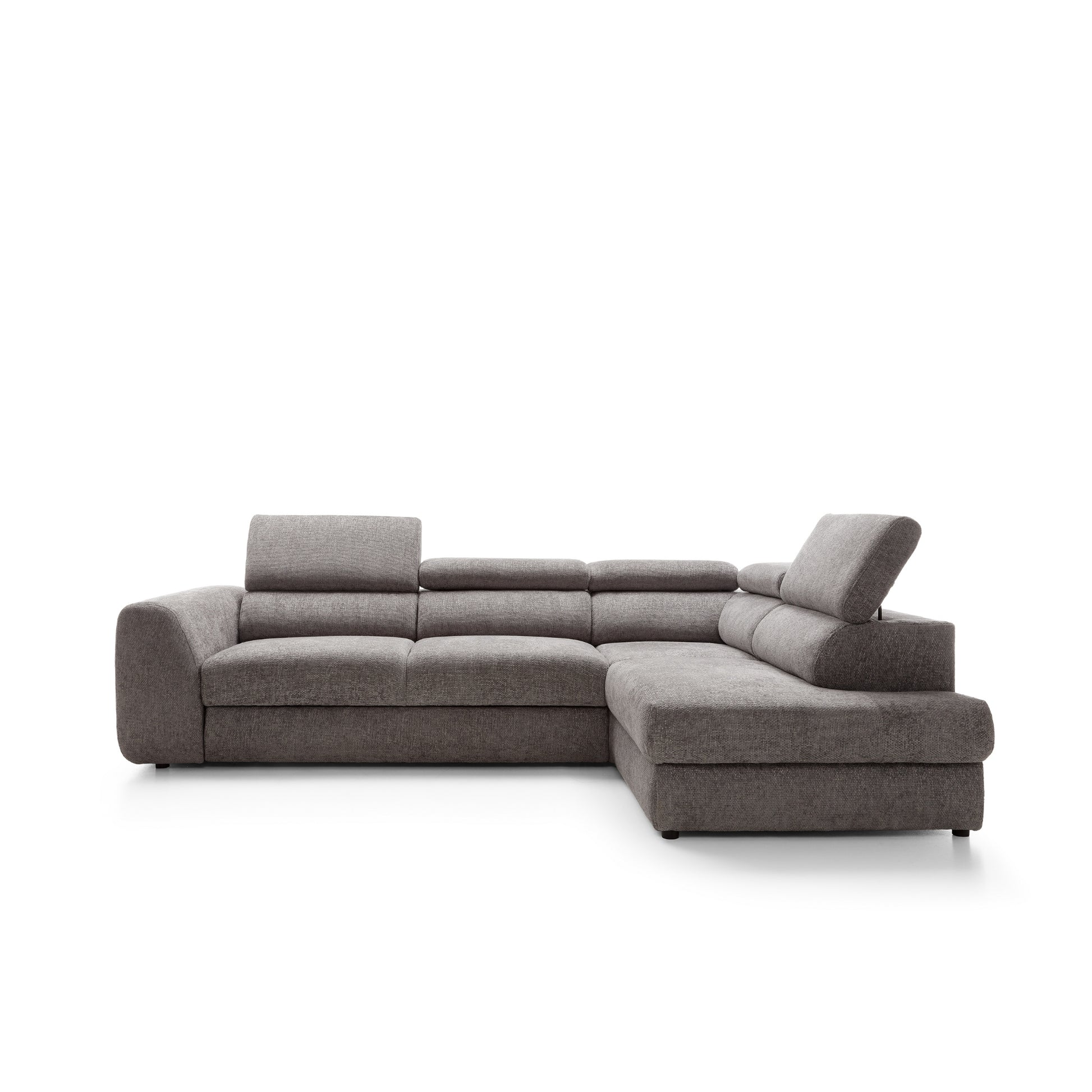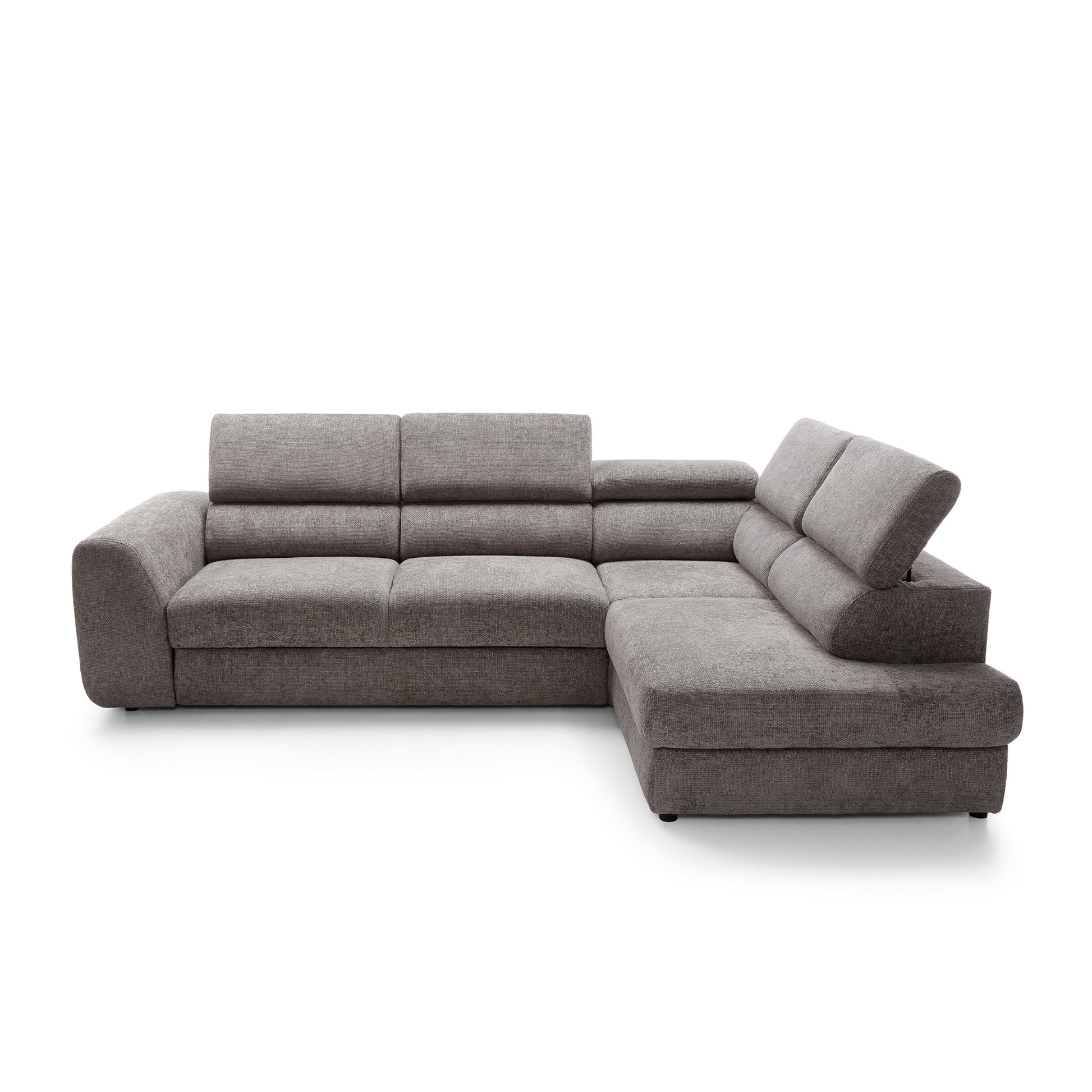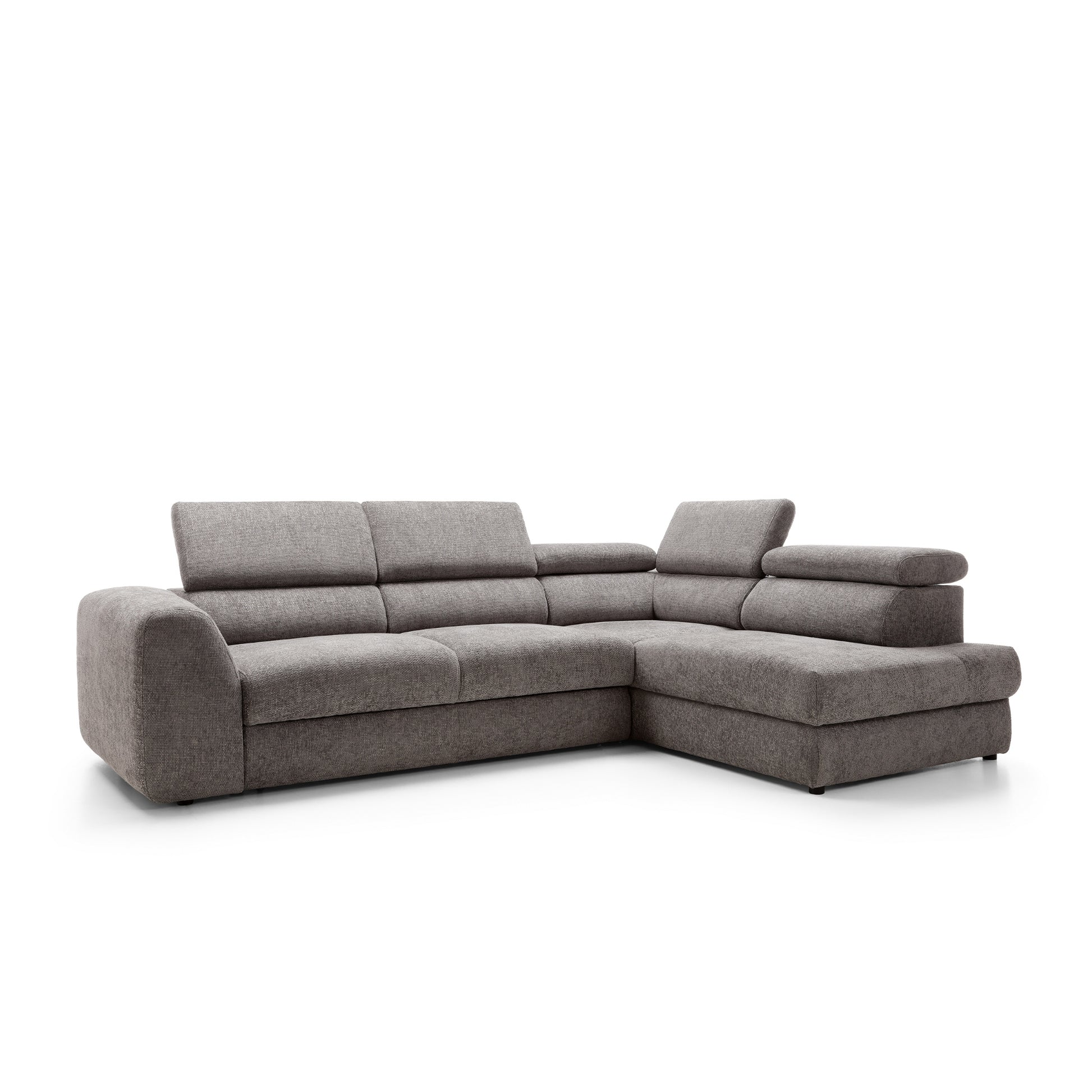 Szerokie, miękkie siedziska i grube oparcia zapewniają wygodę niezależnie od pory dnia. Wydłużona część narożna (207 cm) umożliwia swobodne wyciągnięcie nóg i relaks w pozycji półleżącej. Dodatkowo, regulowane zagłówkipozwalają dopasować kąt podparcia do własnych preferencji – idealne na dłuższy odpoczynek, filmowy wieczór czy popołudniową drzemkę.