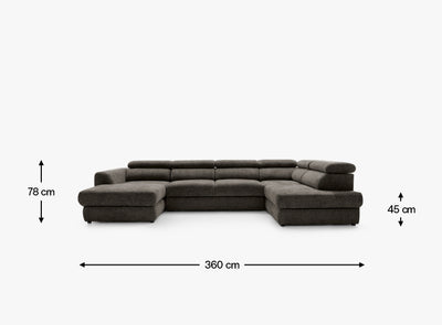 Wymiary całkowite narożnika – 360 cm szerokości, 78 cm wysokości (99 cm z podniesionymi zagłówkami) i 112 cm głębokości – sprawiają, że staje się on dominującym, ale jednocześnie harmonijnym elementem każdej nowoczesnej aranżacji. Podłokietniki o zaokrąglonych krawędziach i wysokości 65 cm dodają mu przytulności, a niskie nóżki (3 cm) nadają lekkości całej konstrukcji.