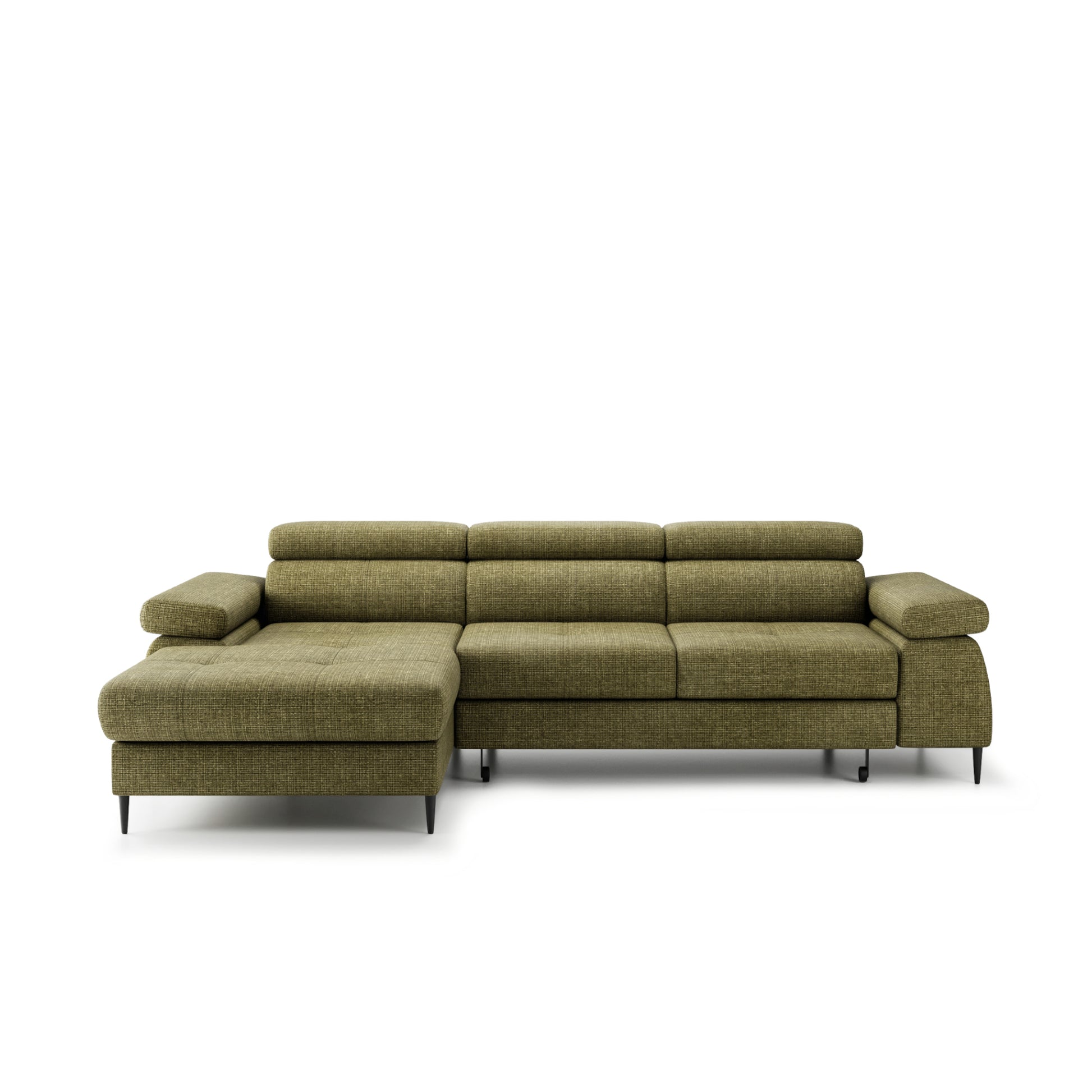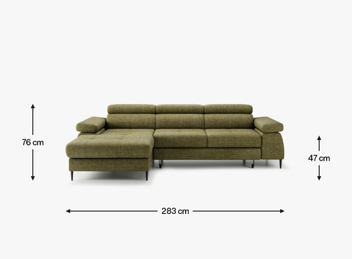 Dzięki funkcji spania opartej na mechanizmie delfin, narożnik w prosty sposób zamienia się w wygodne łóżko o powierzchni 213 × 126 cm – idealne dla gości lub na popołudniową drzemkę. Konstrukcja siedziska opiera się na sprężynach falistych i falistych profilowanych, natomiast oparcie wykonano z pasów tapicerskich i pianki PU, co gwarantuje trwałość, sprężystość i wygodę nawet przy intensywnym użytkowaniu. Dodatkowym atutem są podłokietniki o wysokości 64 cm, które zwiększają komfort wypoczynku.