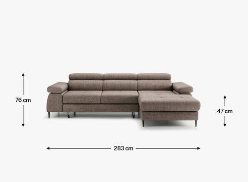Zachwyca nie tylko formą, ale też proporcjami – szerokość 282 cm, głębokość 102 cm, a w części narożnej aż 175 cm – dają poczucie przestrzeni i swobody. Komfort wypoczynku zapewniają głębokie siedziska (59 cm do oparcia) i regulowane zagłówki, które po podniesieniu zwiększają wysokość całkowitą mebla z 76 cm do 90 cm, oferując idealne podparcie dla głowy i szyi. Szerokość użytkowa siedziska to aż 215 cm, a wysokość – 47 cm, co sprawia, że Cordoba I świetnie sprawdzi się zarówno w codziennym użytkowaniu, jak i podczas dłuższego relaksu.