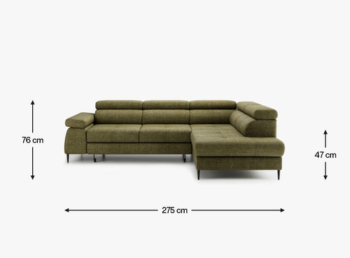 Zachwyca nie tylko formą, ale i proporcjami – szerokość całkowita 275 cm, głębokość 102 cm, a w części przedłużonej aż 203 cm. Szerokość użytkowa siedziska 198 cm oraz wysokość siedziska 47 cm oferują przestrzeń idealną zarówno do codziennego wypoczynku, jak i dłuższego relaksu. Regulowane podłokietniki i zagłówki pozwalają na indywidualne dopasowanie do potrzeb, a wysokość całkowita narożnika od 76 do 90 cm zwiększa komfort użytkowania.