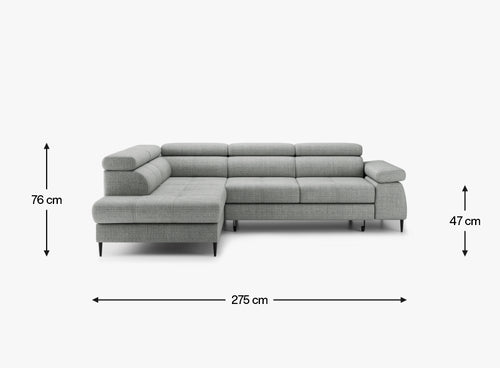Zachwyca nie tylko formą, ale i proporcjami – szerokość całkowita 275 cm, głębokość 102 cm, a w części przedłużonej aż 203 cm. Szerokość użytkowa siedziska 198 cm oraz wysokość siedziska 47 cm oferują przestrzeń idealną zarówno do codziennego wypoczynku, jak i dłuższego relaksu. Regulowane podłokietniki i zagłówki  pozwalają na indywidualne dopasowanie do potrzeb, a wysokość całkowita narożnika od 76 do 90 cm zwiększa komfort użytkowania.