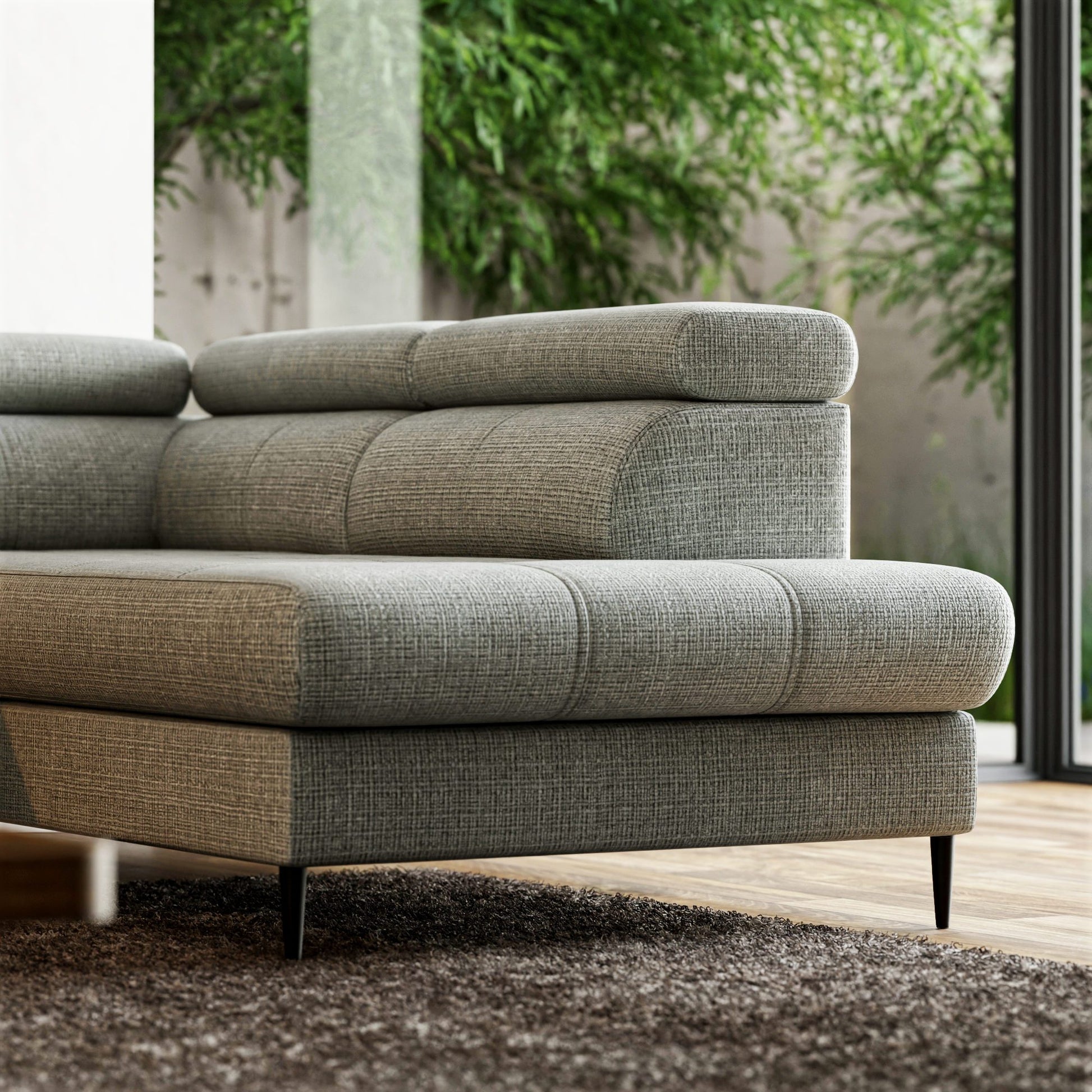 Wykończony tkaniną Cremona, narożnik zachwyca nie tylko wyglądem, ale i trwałością. Cremona to materiał o wysokiej odporności na ścieranie (60 000–70 000 cykli Martindale’a) i gramaturze 465 g/m² ± 5%, cechujący się przyjemną w dotyku strukturą oraz eleganckim wykończeniem, które świetnie prezentuje się w każdym nowoczesnym wnętrzu.
