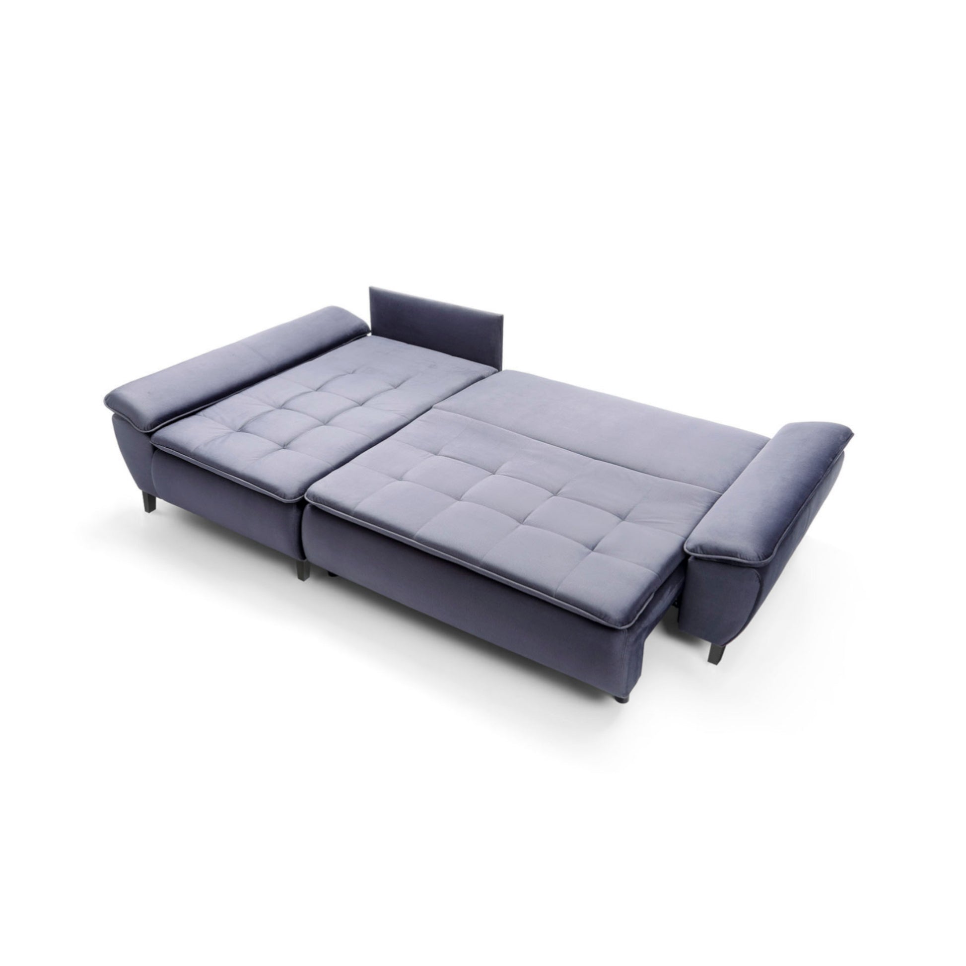 Grafitowy narożnik z dużą powierzchnią spania o wymiarach 227 x 155 cm może zastąpić klasyczne dwuosobowe łóżko. W zestawie wypoczynkowym został zamontowany mechanizm typu DL, dzięki któremu wysunięcie leżanki zajmie nam dosłownie kilka sekund. Pod szezlongiem, czyli przedłużonym bokiem znajdziemy natomiast dużą komorę na pościel, dzięki której przechowywanie kołder czy poduszek stanie się wyjątkowo łatwe.