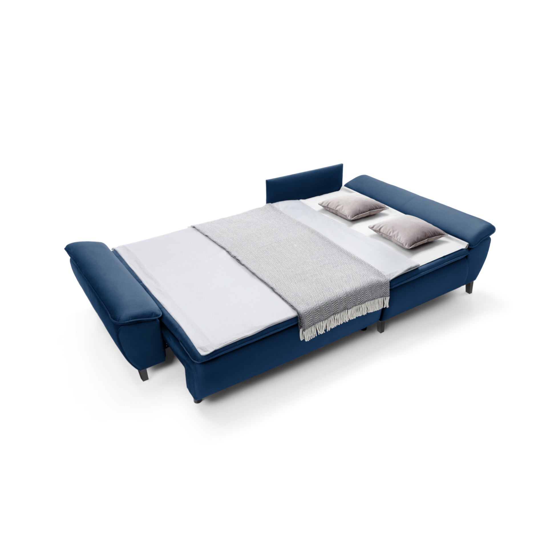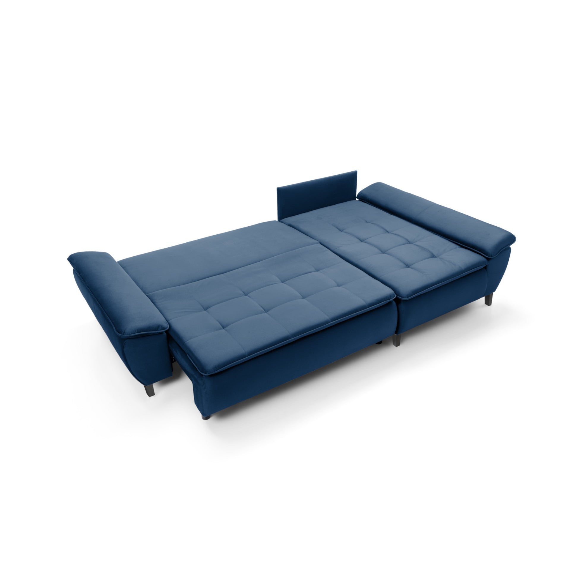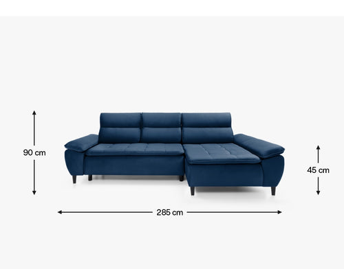 Grafitowy narożnik z dużą powierzchnią spania o wymiarach 227 x 155 cm może zastąpić klasyczne dwuosobowe łóżko. W zestawie wypoczynkowym został zamontowany mechanizm typu DL, dzięki któremu wysunięcie leżanki zajmie nam dosłownie kilka sekund. Pod szezlongiem, czyli przedłużonym bokiem znajdziemy natomiast dużą komorę na pościel, dzięki której przechowywanie kołder czy poduszek stanie się wyjątkowo łatwe.