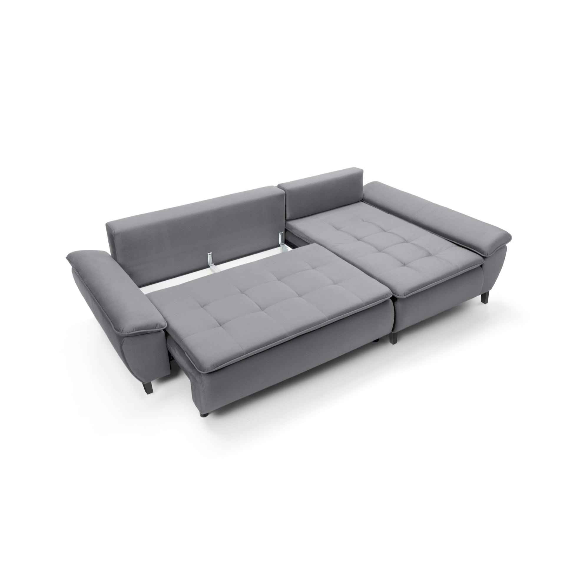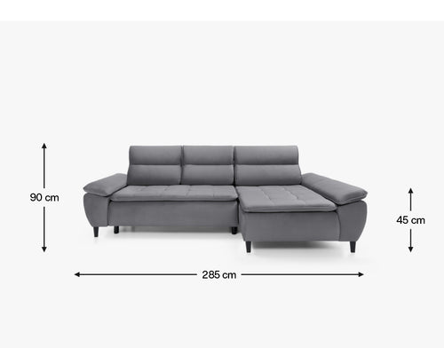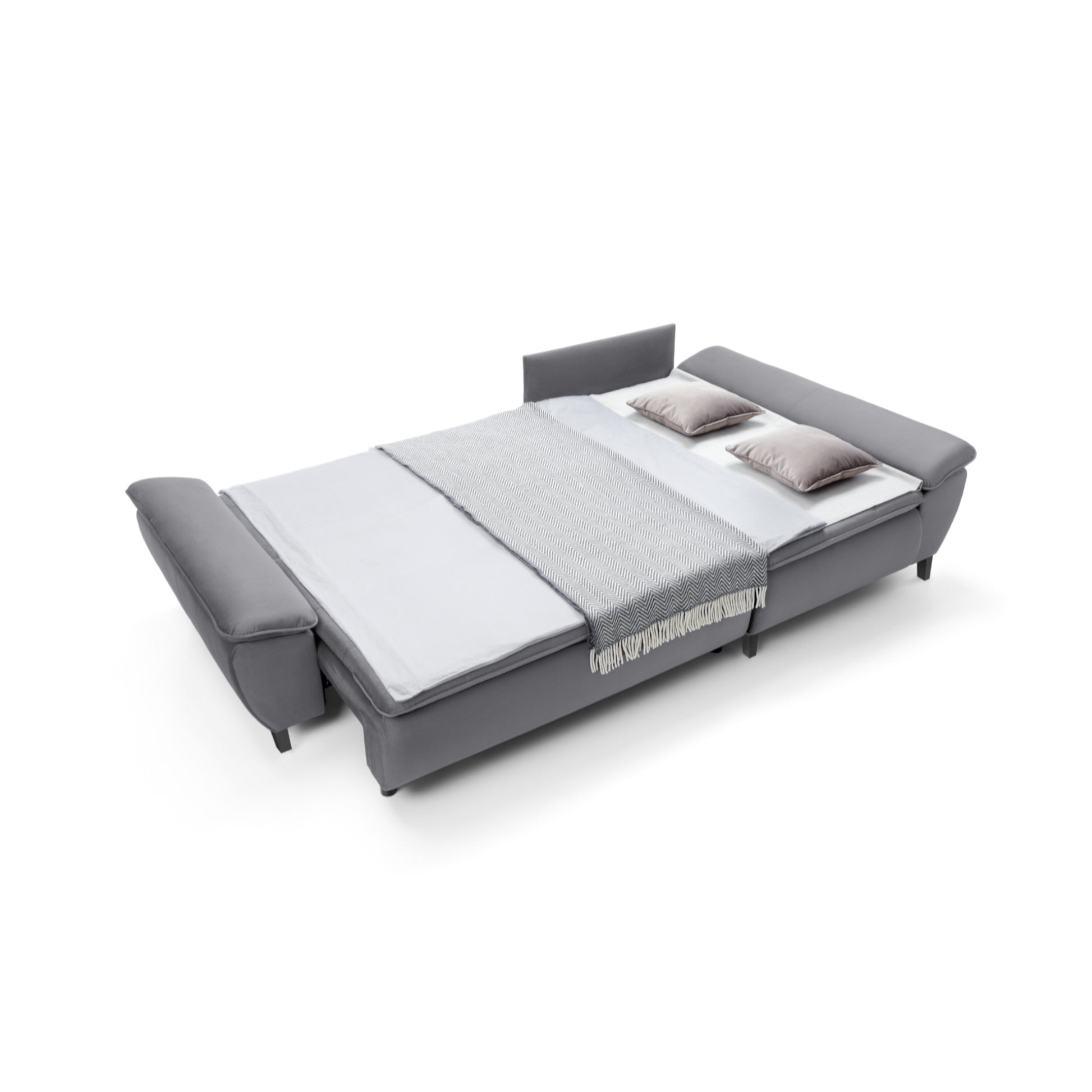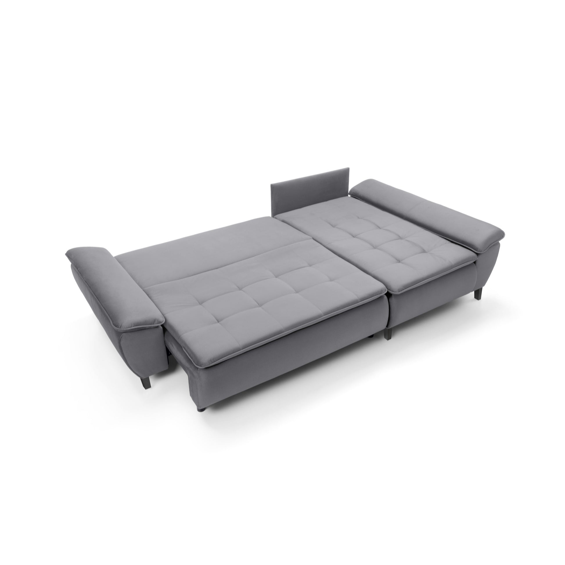 Grafitowy narożnik z dużą powierzchnią spania o wymiarach 227 x 155 cm może zastąpić klasyczne dwuosobowe łóżko. W zestawie wypoczynkowym został zamontowany mechanizm typu DL, dzięki któremu wysunięcie leżanki zajmie nam dosłownie kilka sekund. Pod szezlongiem, czyli przedłużonym bokiem znajdziemy natomiast dużą komorę na pościel, dzięki której przechowywanie kołder czy poduszek stanie się wyjątkowo łatwe.