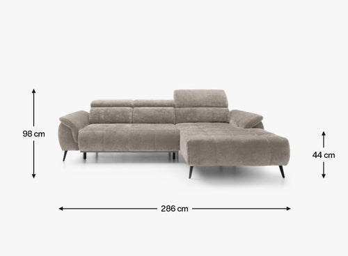 Narożniki z tej linii wyróżniają się niezwykłą wygodą użytkowania, dzięki profilowanym oparciom z możliwością regulacji górnej części – praktycznym zagłówkom. Stylowy wygląd podkreślają eleganckie, dwuigłowe przeszycia z subtelnymi wciągami na siedzisku, ozdobny bok mebla oraz wysokie nóżki, które dodają konstrukcji lekkości i nowoczesnego charakteru.