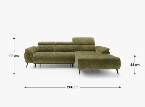Narożniki z tej linii wyróżniają się niezwykłą wygodą użytkowania, dzięki profilowanym oparciom z możliwością regulacji górnej części – praktycznym zagłówkom. Stylowy wygląd podkreślają eleganckie, dwuigłowe przeszycia z subtelnymi wciągami na siedzisku, ozdobny bok mebla oraz wysokie nóżki, które dodają konstrukcji lekkości i nowoczesnego charakteru.