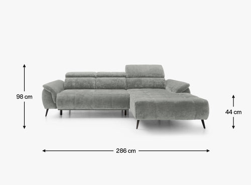 Narożniki z tej linii wyróżniają się niezwykłą wygodą użytkowania, dzięki profilowanym oparciom z możliwością regulacji górnej części – praktycznym zagłówkom. Stylowy wygląd podkreślają eleganckie, dwuigłowe przeszycia z subtelnymi wciągami na siedzisku, ozdobny bok mebla oraz wysokie nóżki, które dodają konstrukcji lekkości i nowoczesnego charakteru.