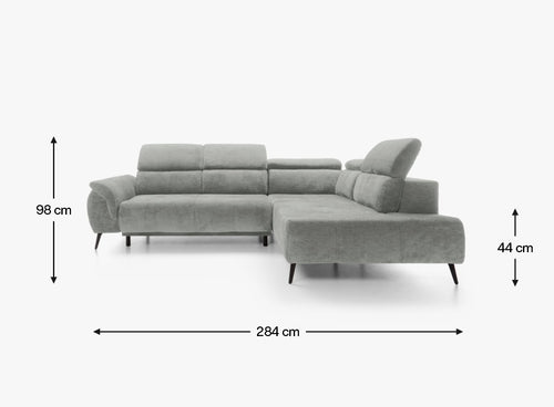 Narożniki z tej linii wyróżniają się niezwykłą wygodą użytkowania, dzięki profilowanym oparciom z możliwością regulacji górnej części – praktycznym zagłówkom. Stylowy wygląd podkreślają eleganckie, dwuigłowe przeszycia z subtelnymi wciągami na siedzisku, ozdobny bok mebla oraz wysokie nóżki, które dodają konstrukcji lekkości i nowoczesnego charakteru.