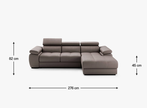 Jego imponujące wymiary – 276 × 175 cm, a także siedzisko o szerokości 217 cm i wysokości 45 cm, zapewniają dużą przestrzeń do wypoczynku. Dzięki funkcji spania o powierzchni 217 × 130 cm, narożnik w kilka chwil zamienia się w komfortowe miejsce do nocnego relaksu.
