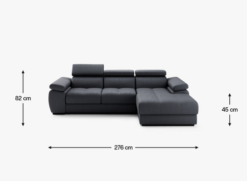 Jego imponujące wymiary – 276 × 175 cm, a także siedzisko o szerokości 217 cm i wysokości 45 cm, zapewniają dużą przestrzeń do wypoczynku. Dzięki funkcji spania o powierzchni 217 × 130 cm, narożnik w kilka chwil zamienia się w komfortowe miejsce do nocnego relaksu.