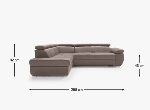 Narożnik lewostronny · funkcja spania · pojemnik na pościel · regulowane podłokietniki · regulowane zagłówki